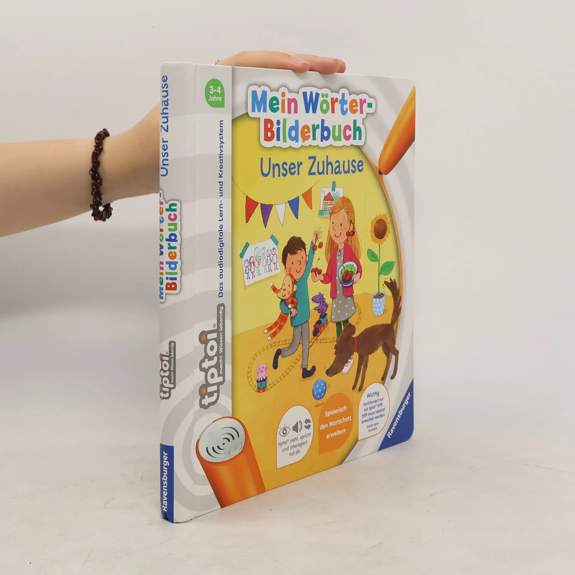 Wörterlernen leicht gemacht: spielerischer Spracherwerb! Willkommen bei uns Zuhause! Hier wohnen Schulkind Lara, Kindergartenkind David und Baby Finn gemeinsam mit ihren Eltern, Großeltern und Hund Rocky. Mit tiptoi erwacht das Zuhause der Hoffmanns zum Leben. Was gibt es in der Küche zu entdecken? Welche Farben hat das Spielzeug? Was macht man vor dem Zubettgehen? Kinder erweitern spielerisch ihren Wortschatz und verinnerlichen erste grammatische Strukturen. Spiele und Lieder vertiefen den gelernten Wortschatz. Mit der Reihe tiptoi Mein Wörter-Bilderbuch bauen Kinder spielerisch ihren Wortschatz auf und erweitern diesen selbstständig. Die kurzen, leicht verständlichen Texte eignen sich ideal für Kinder ab 3 Jahren. Jedes Buch zeigt den Kindern bekannte Szenen und Situationen und vermittelt viele vertraute Begriffe aus dem direkten Umfeld und der Erfahrungswelt der Kinder. Überall gibt es spannende Sätze, zahlreiche Dialoge und lustige Geräusche zu entdecken. Dabei sind die einzelnen Begriffe in ganze Sätze eingebunden, um den Kindern erste grammatische Strukturen zu vermitteln. In jedem Buch wird das Gelernte durch kindgerechte und abwechslungsreiche Spiele mit Lösungskontrolle abgefragt und vertieft. Neukomponierte Lieder und liebevolle Geschichten motivieren zum spielerischen Wörterlernen. tiptoi-Stift nicht enthalten. Muss separat erworben werden.