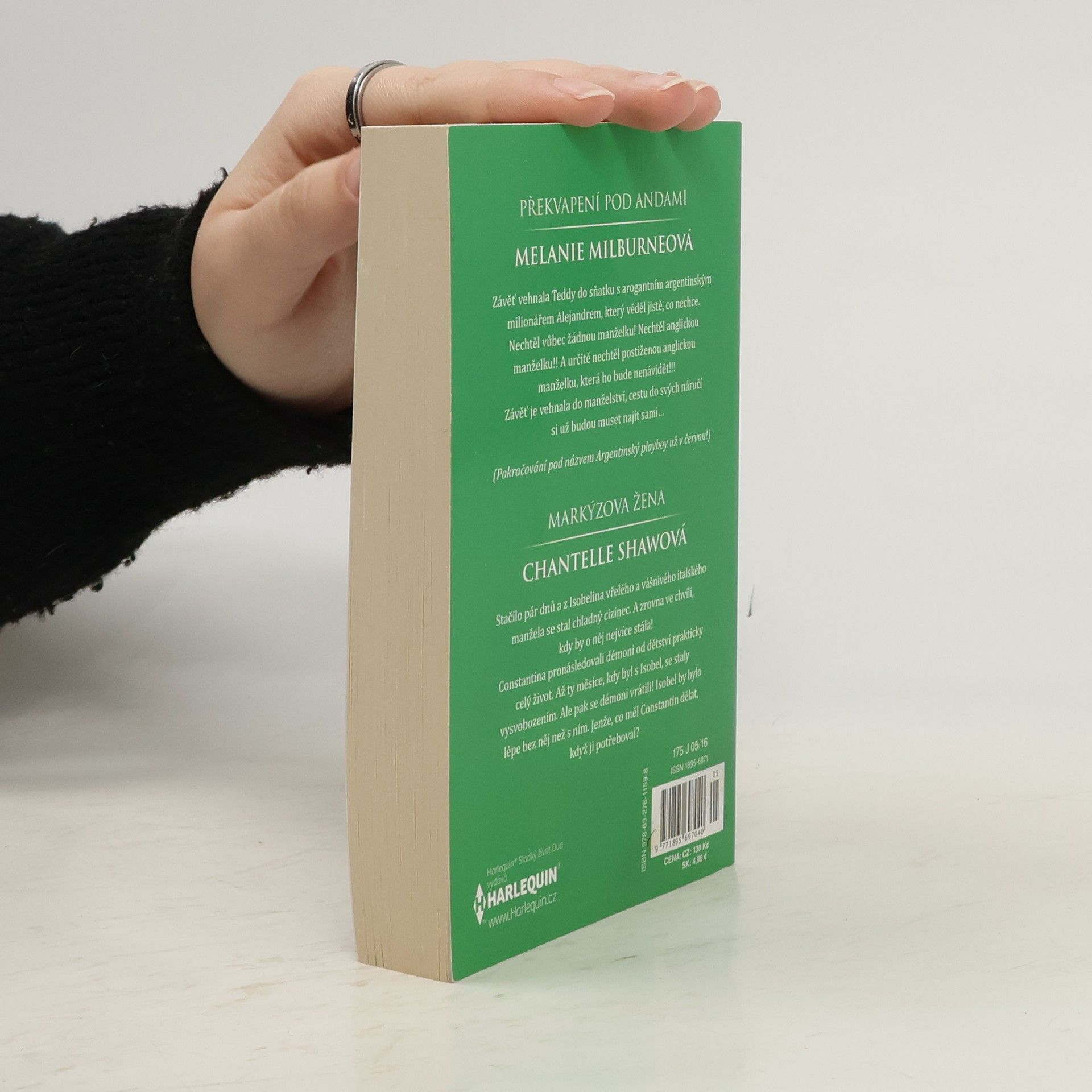 Překvapení pod Andami Závěť vehnala Teddy do sňatku s arogantním argentinským milionářem Alejandrem, který věděl jistě, co nechce. Nechtěl vůbec žádnou manželku! Nechtěl anglickou manželku!! A určitě nechtěl postiženou anglickou manželku, která ho bude nenávidět!!! Závěť je vehnala do manželství, cestu do svých náručí si už budou muset najít sami… (Pokračování pod názvem Argentinský playboy už v červnu!) Markýzova žena Stačilo pár dnů a z Isobelina vřelého a vášnivého italského manžela se stal chladný cizinec. A zrovna ve chvíli, kdy by o něj nejvíce stála! Constantina pronásledovali démoni od dětství prakticky celý život. Až ty měsíce, kdy byl s Isobel, se staly vysvobozením. Ale pak se démoni vrátili! Isobel by bylo lépe bez něj než s ním. Jenže, co měl Constantin dělat, když ji potřeboval?