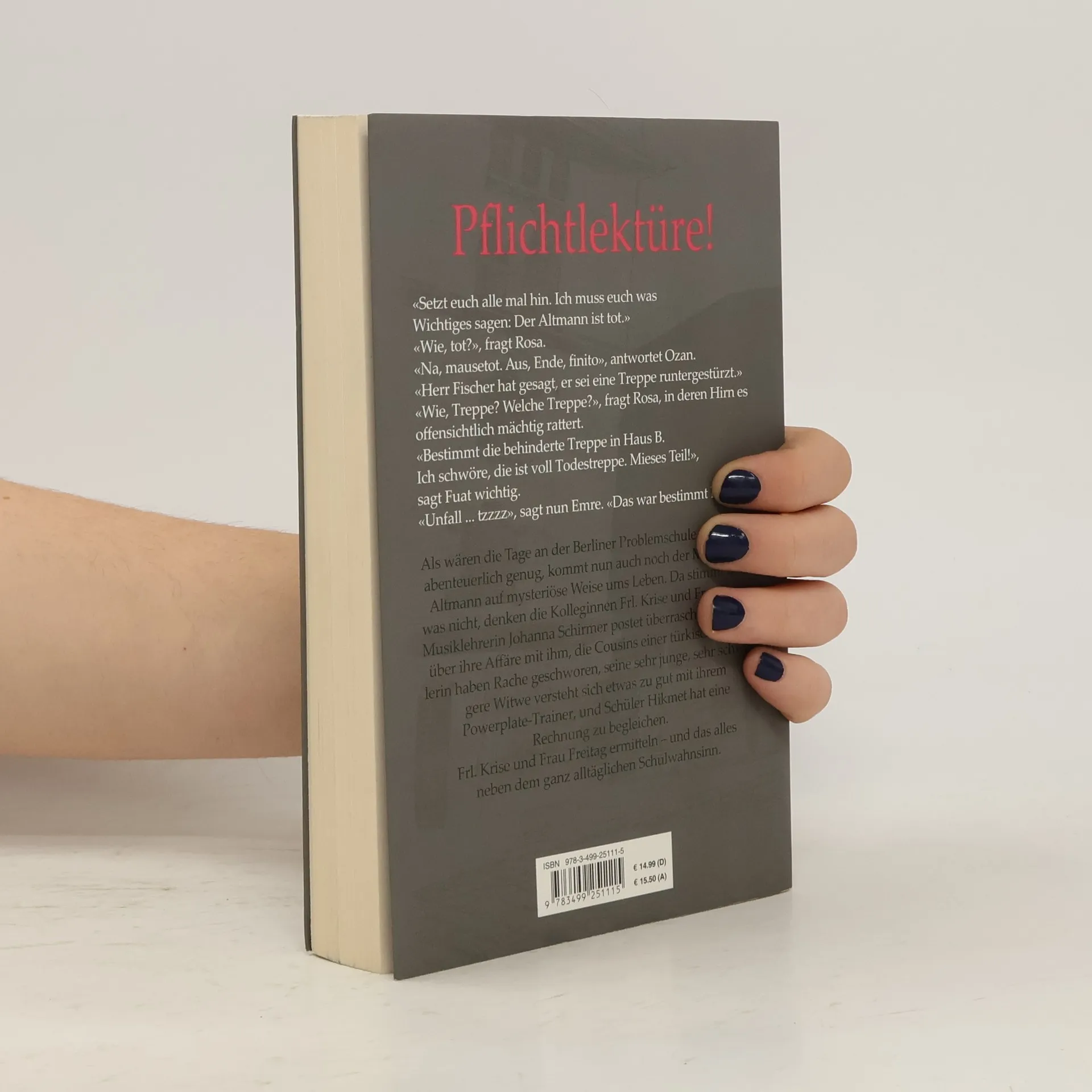 Pflichtlektüre!«Setzt euch alle mal hin. Ich muss euch was Wichtiges sagen: Der Altmann ist tot.»«Wie, tot?», fragt Rosa.«Na, mausetot. Aus, Ende, finito», antwortet Oszan.«Herr Fischer hat gesagt, er sei eine Treppe runtergestürzt.»«Wie, Treppe? Welche Treppe?», fragt Rosa, in deren Hirn es offensichtlich mächtig rattert.«Bestimmt die behinderte Treppe in Haus B. Ich schwöre, die ist voll Todestreppe. Mieses Teil!», sagt Fuat wichtig.«Unfall ... tzzzz», sagt nun Emre. «Das war bestimmt Mord!»Als wären die Tage an der Berliner Problemschule nicht schon abenteuerlich genug, kommt nun auch noch der Mathelehrer Altmann auf mysteriöse Weise ums Leben. Da stimmt doch was nicht, denken die Kolleginnen Frl. Krise und Frau Freitag: Musiklehrerin Johanna Schirmer postet überraschende Details über ihre Affäre mit ihm, die Cousins einer türkischen Schülerin hatten Rache geschworen, seine sehr junge, sehr schwangere Witwe versteht sich etwas zu gut mit ihrem Powerplate-Trainer, und Schüler Hikmet hat eine Rechnung zu begleichen. Frl. Krise und Frau Freitag ermitteln - und das alles neben dem ganz alltäglichen Schulwahnsinn.