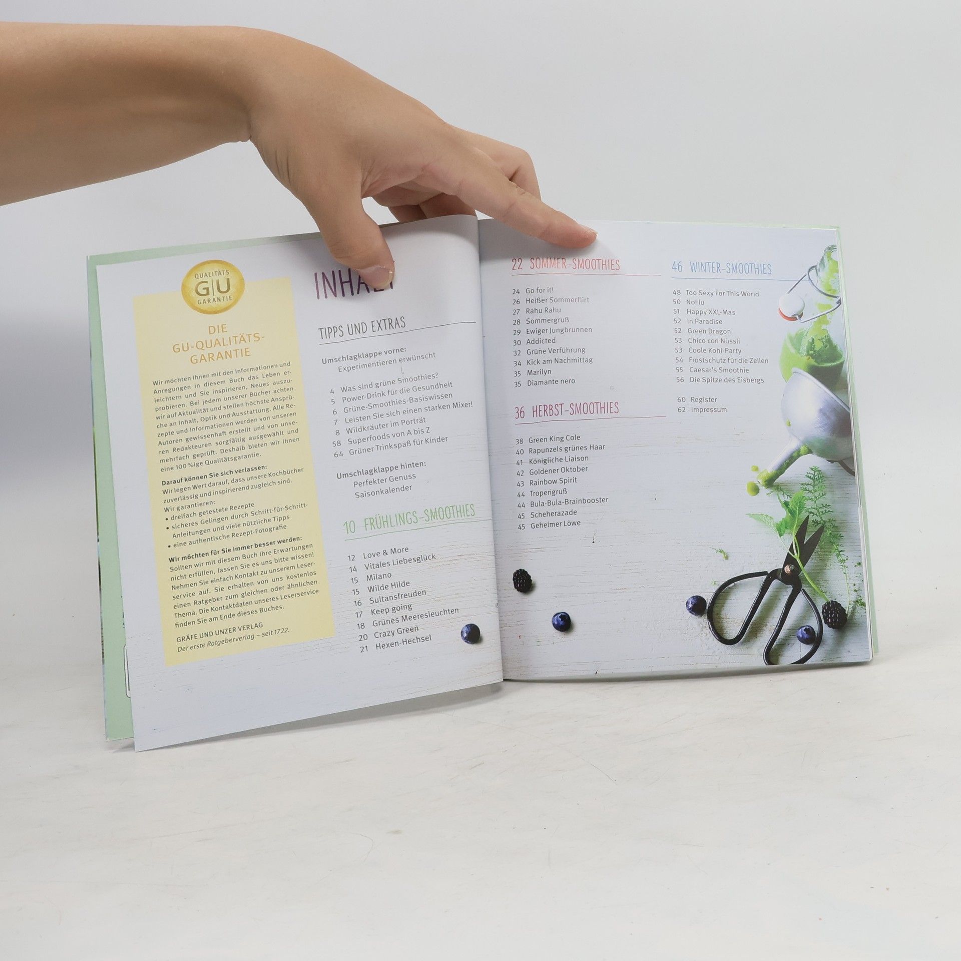 Eingeführte Reihe, seit 2013 in neuem Layout: ansprechende, zeitgemäe︢ Aufmachung und handliches Format, nun mit einer kostenlosen App zum Sammeln der Lieblingsrezepte. Geblieben sind die ausklappbaren Umschlagseiten, hier mit Basics, Tipps, weiteren Rezepten und Saisonkalender. Im Hauptteil werden rund 40 Rezepte für die "Zauberdrinks" aus dem Mixer vorgestellt, für jede Jahreszeit den passenden Power-Drink. Eingeteilt in die 4 Jahreszeiten findet man hier Drinks mit etwas ausgefallenen Namen wie Vitales Liebesglück, Grüne Verführung, Rapunzels grünes Haar oder Frostschutz für die Zellen etc. Vorab Basiswissen und Wildkräuter im Porträt. - Eine hübsch aufgemachte, gut brauchbare kleine Sammlung mit klaren Arbeitsanleitungen und Farbfoto zu jedem Rezept. Der gleichnamige Titel aus der Reihe (ID-A 10/13) bietet andere Rezepte. (2)
