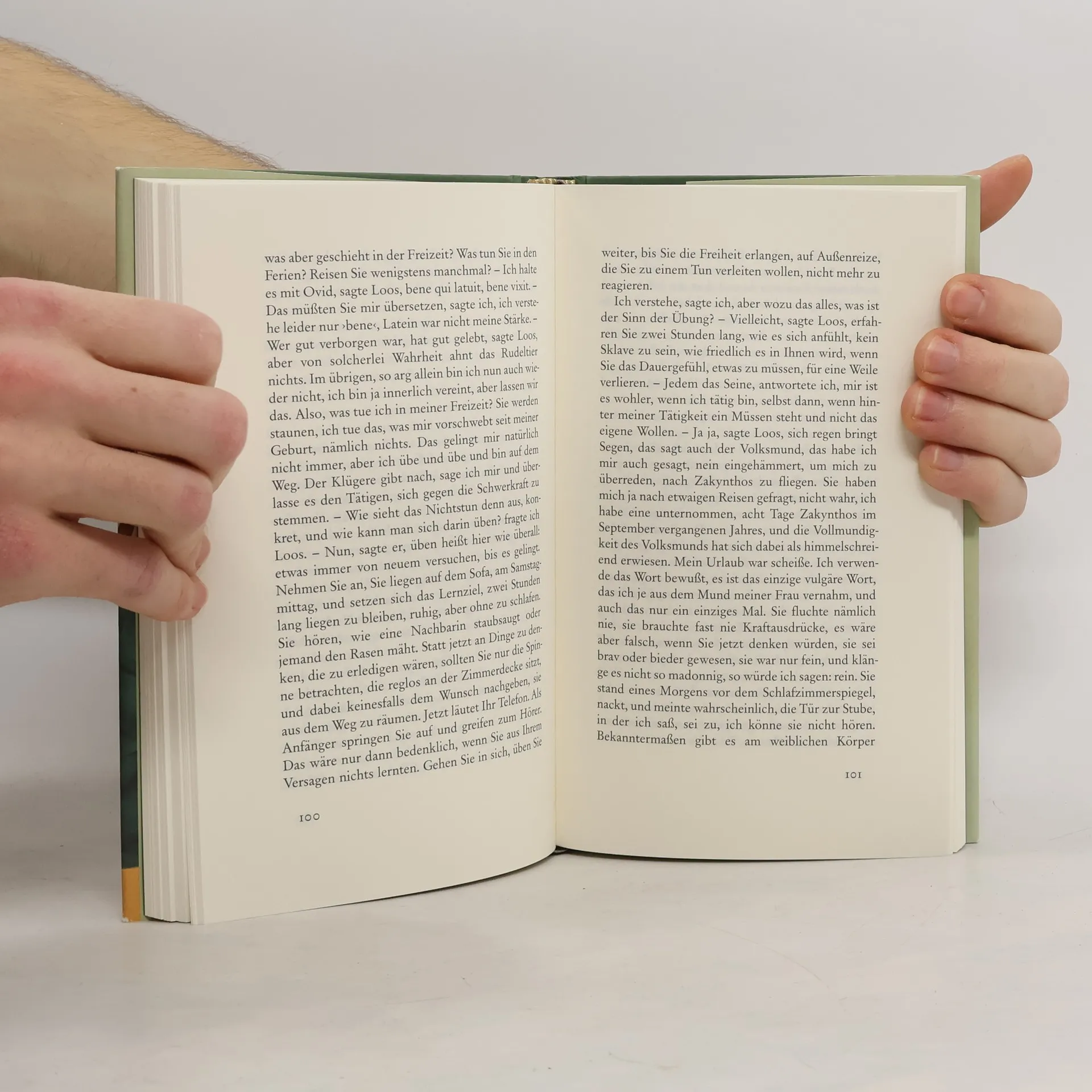 Der junge Scheidungsanwalt Clarin freut sich auf ein ungestörtes Pfingstwochenende in seinem Tessiner Ferienhaus, wo er einen Aufsatz für eine Fachzeitschrift schreiben möchte. Am ersten Abend lernt er auf der Terrasse des Hotels Bellavista einen älteren Mann kennen, einen scheinbar Verwirrten, einen Verrückten vielleicht. Sie reden und debattieren bis tief in die Nacht, und allmählich erzählen sie sich auch ihre Geschichten und Liebesgeschichten. Was als stockendes Gespräch zwischen Zufallsbekannten begonnen hat, entwickelt eine fiebrige, beklemmende Dynamik, der sich weder Clarin noch der Leser entziehen kann. Es sind zweifelhafte Umstände, unter denen Loos seine geliebte, fast vergötterte Frau verloren hat, und dieser Verlust scheint ihm die Welt schwer und verhasst zu machen. Clarin hingegen lebt leicht und gern. – Ferner könnten zwei Menschen einander nicht sein. Wie nah sie sich sind, stellt sich erst spät heraus.