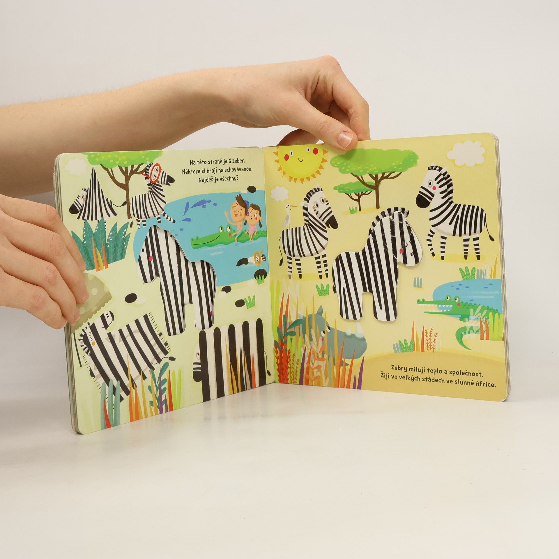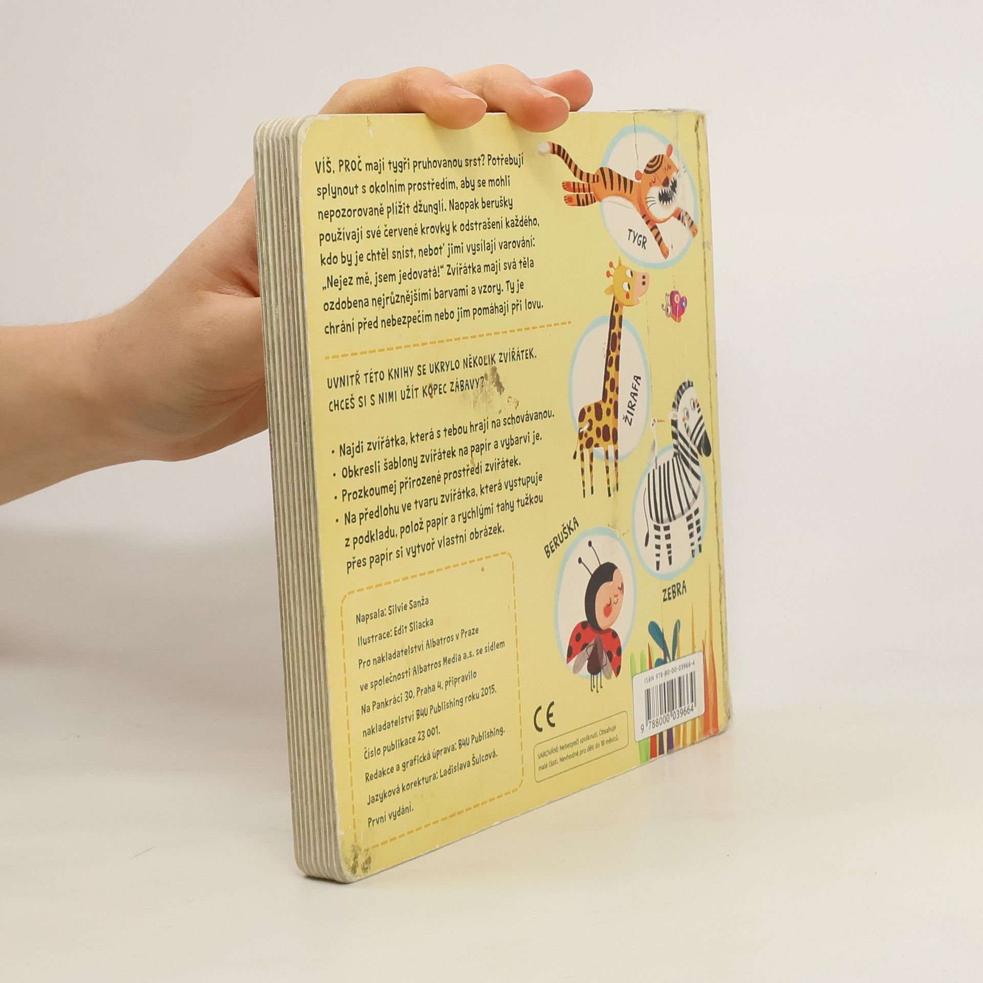 Víš, proč mají tygři pruhovanou srst? Potřebují splynout s okolním prostředím, aby se mohli nepozorovaně plížit džunglí. Naopak berušky používají své červené krovky k odstrašení každého, kdo by je chtěl sníst, neboť jimi vysílají varování:„Nejez mě, jsem jedovatá!“ Zvířátka mají svá těla ozdobena nejrůznějšími barvami a vzory. Ty je chrání před nebezpečím nebo jim pomáhají při lovu. Uvnitř této knihy se ukrylo několik zvířátek. Chceš si s nimi užít kopec zábavy? Najdi zvířátka, která s tebou hrají na schovávanou. Obkresli šablony zvířátek na papír a vybarvi je. Prozkoumej přirozené prostředí zvířátek. Na předlohu ve tvaru zvířátka, která vystupuje z podkladu, polož papír a rychlými tahy tužkou přes papír si vytvoř vlastní obrázek.