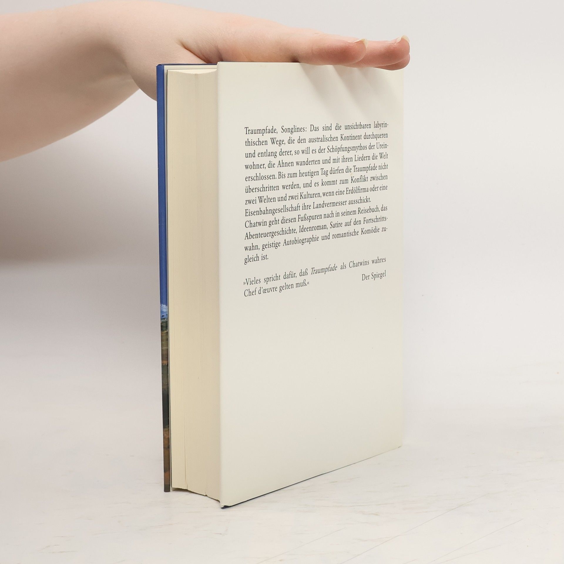 Traumpfade, Songlines: das sind die unsichtbaren labyrinthischen Wege, die den australischen Kontinent durchqueren und entlang denen die Ahnen der Ureinwohner wanderten, die mit ihren Liedern die Welt erschlossen. Bis heute dürfen die Traumpfade nicht überschritten werden, und es kommt zum Konflikt zwischen zwei Welten, wenn eine Eisenbahngesellschaft ihre Landvermesser ausschickt. In seinem Reisebuch, das Ideenroman, Abenteuergeschichte, Satire auf den Fortschrittswahn und geistige Autobiographie zugleich ist, schildert Bruce Chatwin eine Reise durch Australien. Der Roman ist durchzogen von grandiosen Landschaftsbeschreibungen, leuchtenden Details und Reflexionen, die alle in ein Hohelied auf den Menschen münden.