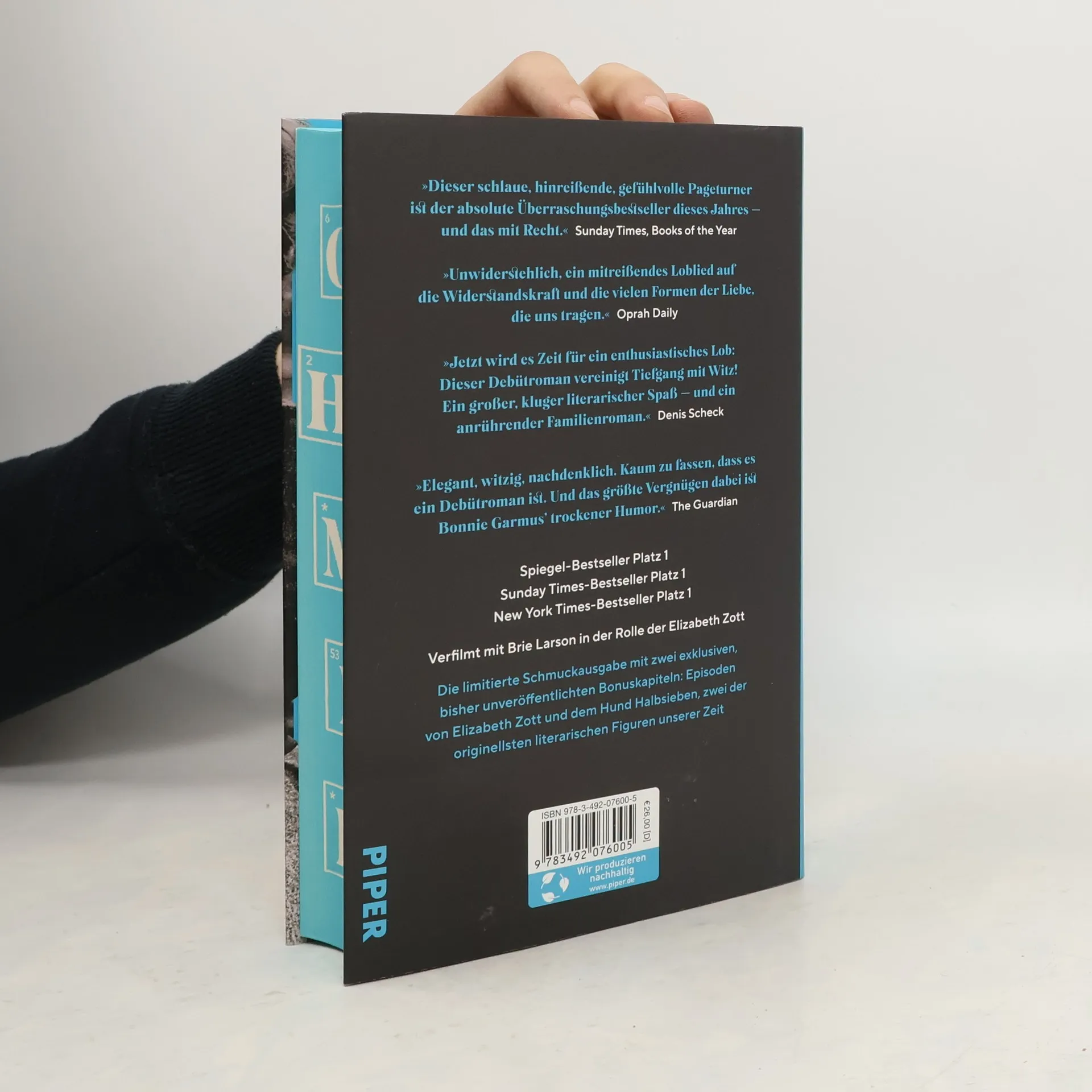»Jetzt wird es Zeit für ein enthusiastisches Lob: Dieser Debütroman vereinigt Tiefgang mit Witz! Ein großer, kluger literarischer Spaß – und ein anrührender Familienroman.« Denis Scheck »In Elizabeth Zott verliebt man sich total. Sie ist so toll und natürlich dargestellt, dass ich sie sogar gegoogelt habe: Die muss es doch wirklich geben, habe ich gedacht! Lange habe ich nicht ein so unterhaltendes, witziges und kluges Buch gelesen wie dieses.« Elke Heidenreich »Klug, charmant und warmherzig. Eine wunderbare Protagonistin, das Thema Emanzipation und Selbstbestimmung, tragische Entwicklungen und ein wirklich mitreißender Plot.« BuchMarkt Online Elizabeth Zott ist eine Frau mit dem unverkennbaren Auftreten eines Menschen, der nicht durchschnittlich ist und es nie sein wird. Doch es ist 1961, und die Frauen tragen Hemdblusenkleider und treten Gartenvereinen bei. Niemand traut ihnen zu, Chemikerin zu werden. Außer Calvin Evans, dem einsamen, brillanten Nobelpreiskandidaten, der sich ausgerechnet in Elizabeths Verstand verliebt. Aber auch 1961 geht das Leben eigene Wege. Und so findet sich eine alleinerziehende Elizabeth Zott bald in der TV-Show »Essen um sechs« wieder. Doch für sie ist Kochen Chemie. Und Chemie bedeutet Veränderung der Zustände ... »Eine Frage der Chemie« stürmte auf Anhieb die Bestsellerlisten und hat seit seiner Publikation im Frühjahr 2022 weltweit Millionen von Leser: innen begeistert. Bonnie Garmus' Schlüssel zum Erfolg für ihr hinreißend erzähltes Buch lässt sich in zwei Worten zusammenfassen: Elizabeth Zott. Sprühend vor Originalität, Sprachwitz und mit ihrer außergewöhnlichen Heldin gelingt es Bonnie Garmus, unseren Verstand und unser Herz zu erobern – und das nicht zuletzt mit einem Hund namens Halbsieben, der Elizabeth in ihren dunkelsten Stunden beisteht und den Roman mit großer, heiterer Lebensweisheit erfüllt. Ihnen beiden sind auch die beiden Bonuskapitel gewidmet, die diese limitierte Schmuckausgabe abrunden. Aus dem Englischen von Ulrike Wasel und Klaus Timmermann, dem Übersetzerduo von Delia Owens' »Der Gesang der Flusskrebse« »So einen unterhaltsamen und zugleich blitzgescheiten Roman habe ich schon lange nicht mehr gelesen!« Kölner Stadt-Anzeiger Auszeichnungen und Preise: Lieblingsbuch der Unabhängigen, Spiegel-Jahresbestseller 2022, British Book Awards Author of the Year 2023, Sunday Times Best Fiction Books of 2022, The New York Times 100 Notable Books of 2022, Barnes & Noble Book of the Year 2022, Waterstones Author of the Year 2022, Hay Festival Book of the Year 2022