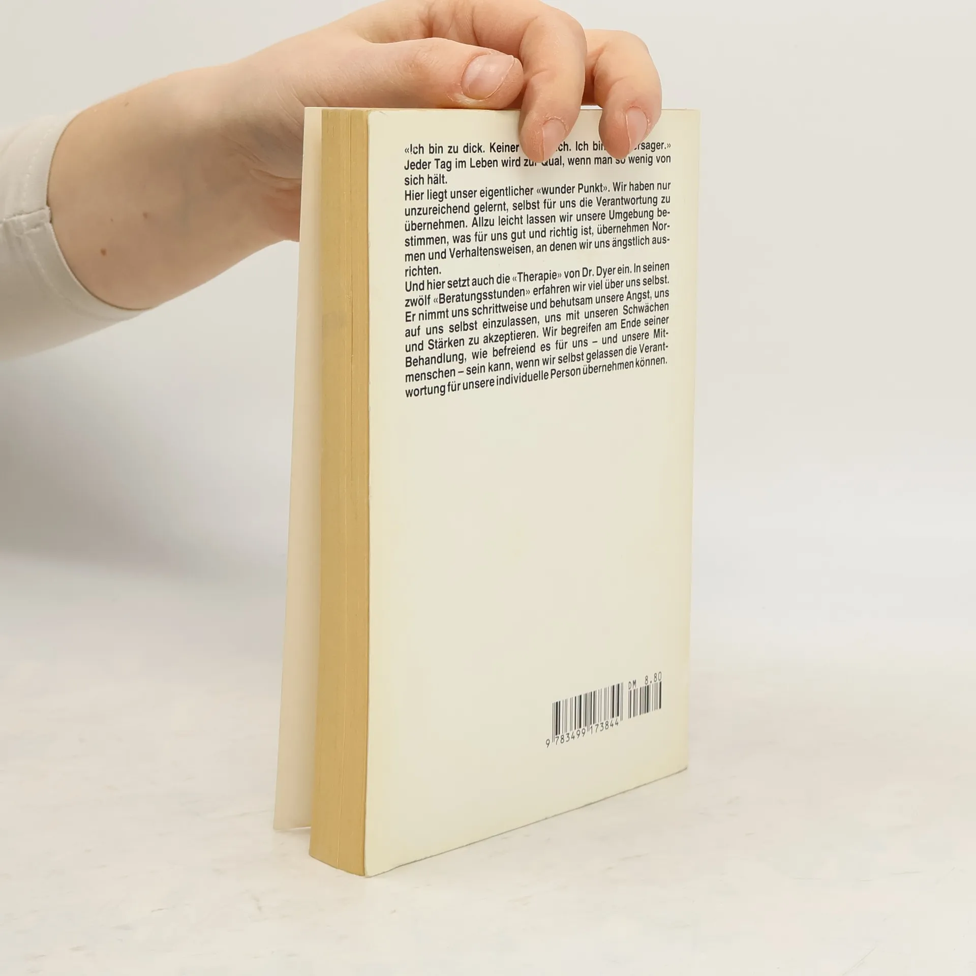«Ich bin zu dick. Keiner liebt mich. Ich bin ein Versager.» Jeder Tag im Leben wird zur Qual, wenn man so wenig von sich hält. Hier liegt unser eigentlicher «wunder Punkt». Wir haben nur unzureichend gelernt, selbst für uns die Verantwortung zu übernehmen. Allzu leicht lassen wir unsere Umgebung bestimmen, was für uns gut und richtig ist, übernehmen Normen und Verhaltensweisen, an denen wir uns ängstlich ausrichten. Und hier setzt auch die «Therapie» von Dr. Dyer ein. In seinen zwölf «Beratungsstunden» erfahren wir viel über uns selbst. Er nimmt uns schrittweise und behutsam unsere Angst, uns auf uns selbst einzulassen, uns mit unseren Schwächen und Stärken zu akzeptieren. Wir begreifen am Ende seiner Behandlung, wie befreiend es für uns - und unsere Mitmenschen - sein kann, wenn wir selbst gelassen die Verantwortung für unsere individuelle Person übernehmen können.