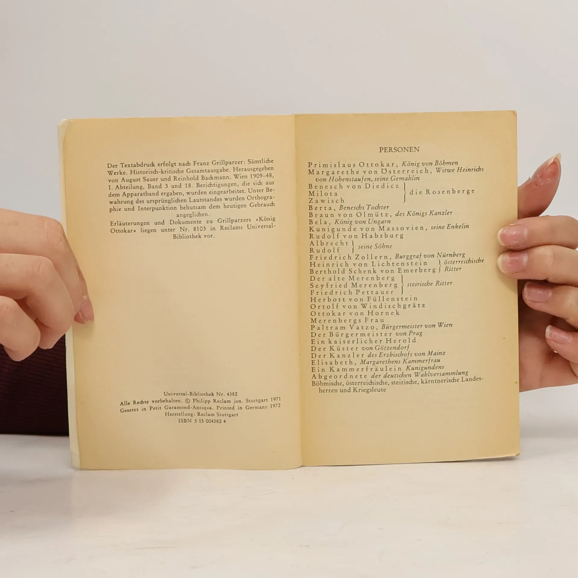 Franz Grillparzer: König Ottokars Glück und Ende. Trauerspiel in fünf Aufzügen Entstanden 1823. Erstdruck: Wien (Wallishauser) 1825. Uraufführung am 19.2.1825 in Wien. Vollständige Neuausgabe mit einer Biographie des Autors. Herausgegeben von Karl-Maria Guth. Berlin 2015, 2. Auflage. Textgrundlage ist die Ausgabe: Franz Grillparzer: Sämtliche Werke. Ausgewählte Briefe, Gespräche, Berichte. Herausgegeben von Peter Frank und Karl Pörnbacher, München: Hanser, [1960–1965]. Die Paginierung obiger Ausgabe wird in dieser Neuausgabe als Marginalie zeilengenau mitgeführt. Umschlaggestaltung von Thomas Schultz-Overhage unter Verwendung des Bildes: Alfons Mucha, König Premysl Ottokar II. Der Bund der slawischen Dynastien, 1924. Gesetzt aus Minion Pro, 11 pt.
