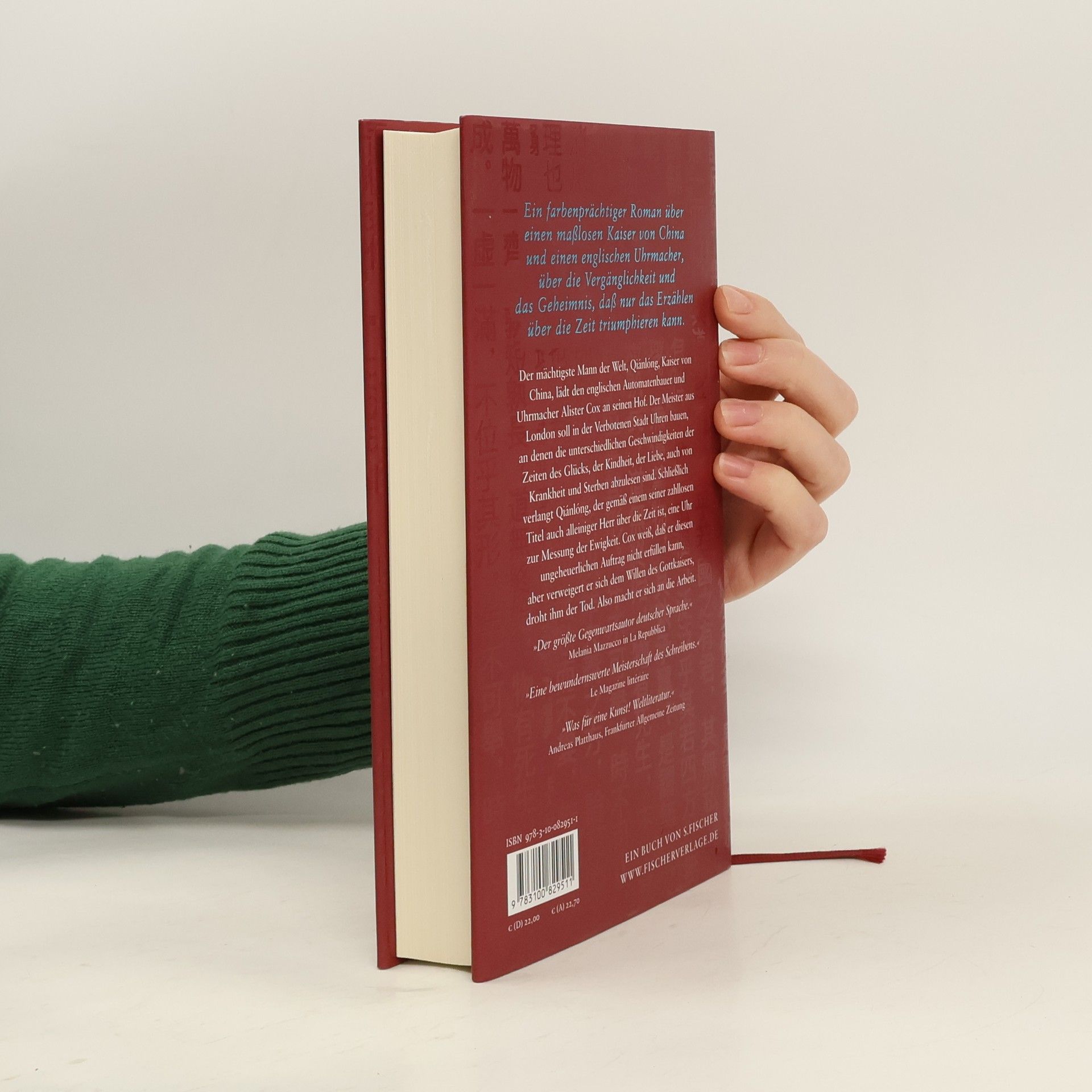 Ein farbenprächtiger Roman über einen maßlosen Kaiser von China und einen englischen Uhrmacher, über die Vergänglichkeit und das Geheimnis, dass nur das Erzählen über die Zeit triumphieren kann. Der mächtigste Mann der Welt, Qiánlóng, Kaiser von China, lädt den englischen Automatenbauer und Uhrmacher Alister Cox an seinen Hof. Der Meister aus London soll in der Verbotenen Stadt Uhren bauen, an denen die unterschiedlichen Geschwindigkeiten der Zeiten des Glücks, der Kindheit, der Liebe, auch von Krankheit und Sterben abzulesen sind. Schließlich verlangt Qiánlóng, der gemäß einem seiner zahllosen Titel auch alleiniger Herr über die Zeit ist, eine Uhr zur Messung der Ewigkeit. Cox weiß, dass er diesen ungeheuerlichen Auftrag nicht erfüllen kann, aber verweigert er sich dem Willen des Gottkaisers, droht ihm der Tod. Also macht er sich an die Arbeit.