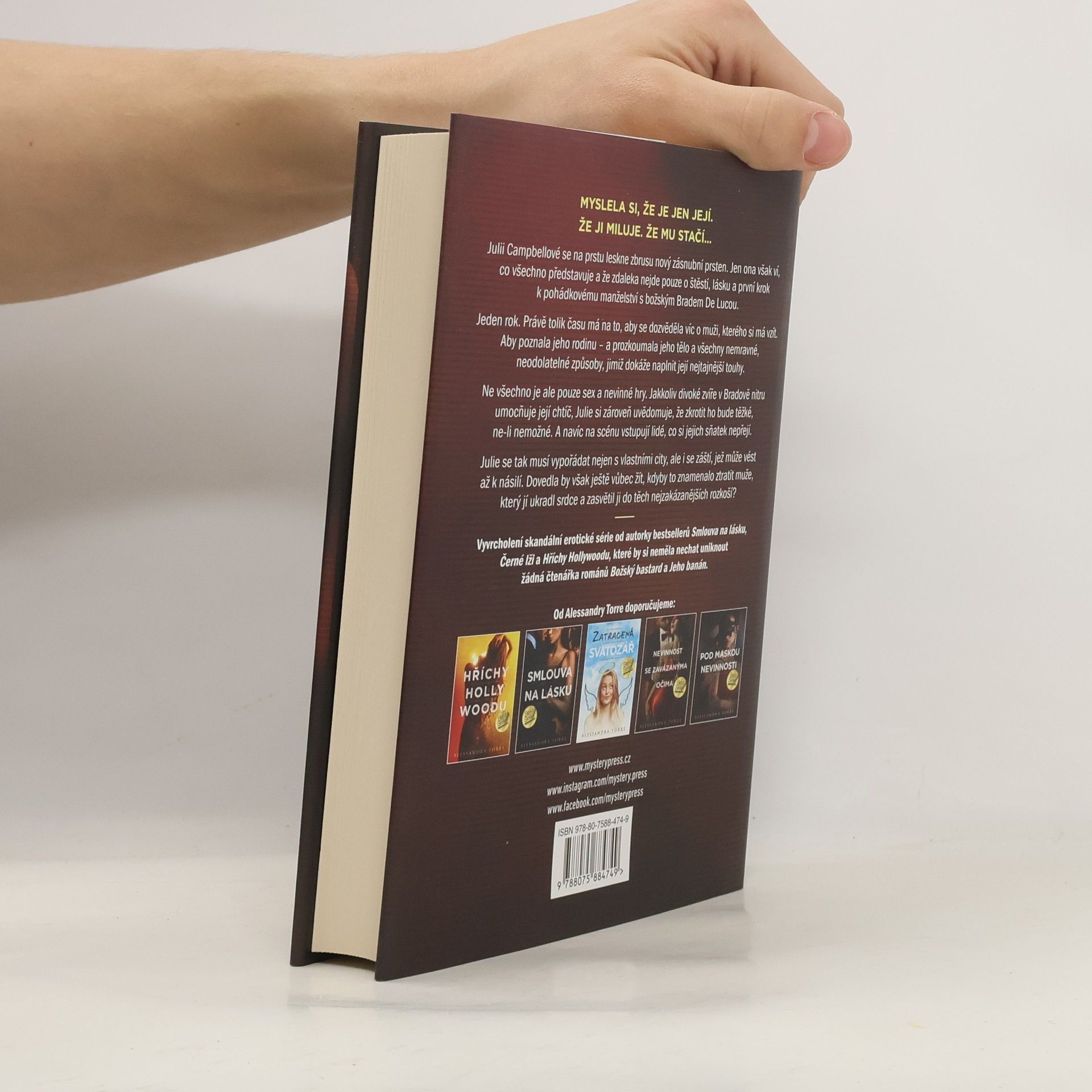 MYSLELA SI, ŽE JE JEN JEJÍ. ŽE JI MILUJE. ŽE MU STAČÍ…Julii Campbellové se na prstu leskne zbrusu nový zásnubní prsten. Jen ona však ví, co všechno představuje a že zdaleka nejde pouze o štěstí, lásku a první krok k pohádkovému manželství s božským Bradem De Lucou.Jeden rok. Právě tolik času má na to, aby se dozvěděla víc o muži, kterého si má vzít. Aby poznala jeho rodinu – a prozkoumala jeho tělo a všechny nemravné, neodolatelné způsoby, jimiž dokáže naplnit její nejtajnější touhy.Ne všechno je ale pouze sex a nevinné hry. Jakkoliv divoké zvíře v Bradově nitru umocňuje její chtíč, Julie si zároveň uvědomuje, že zkrotit ho bude těžké, ne-li nemožné. A navíc na scénu vstupují lidé, co si jejich sňatek nepřejí.Julie se tak musí vypořádat nejen s vlastními city, ale i se záští, jež může vést až k násilí. Dovedla by však ještě vůbec žít, kdyby to znamenalo ztratit muže, který jí ukradl srdce a zasvětil ji do těch nejzakázanějších rozkoší?___Vyvrcholení skandální erotické série od autorky bestsellerů Smlouva na lásku, Černé lži a Hříchy Hollywoodu, které by si neměla nechat uniknout žádná čtenářka románů Božský bastard a Jeho banán.