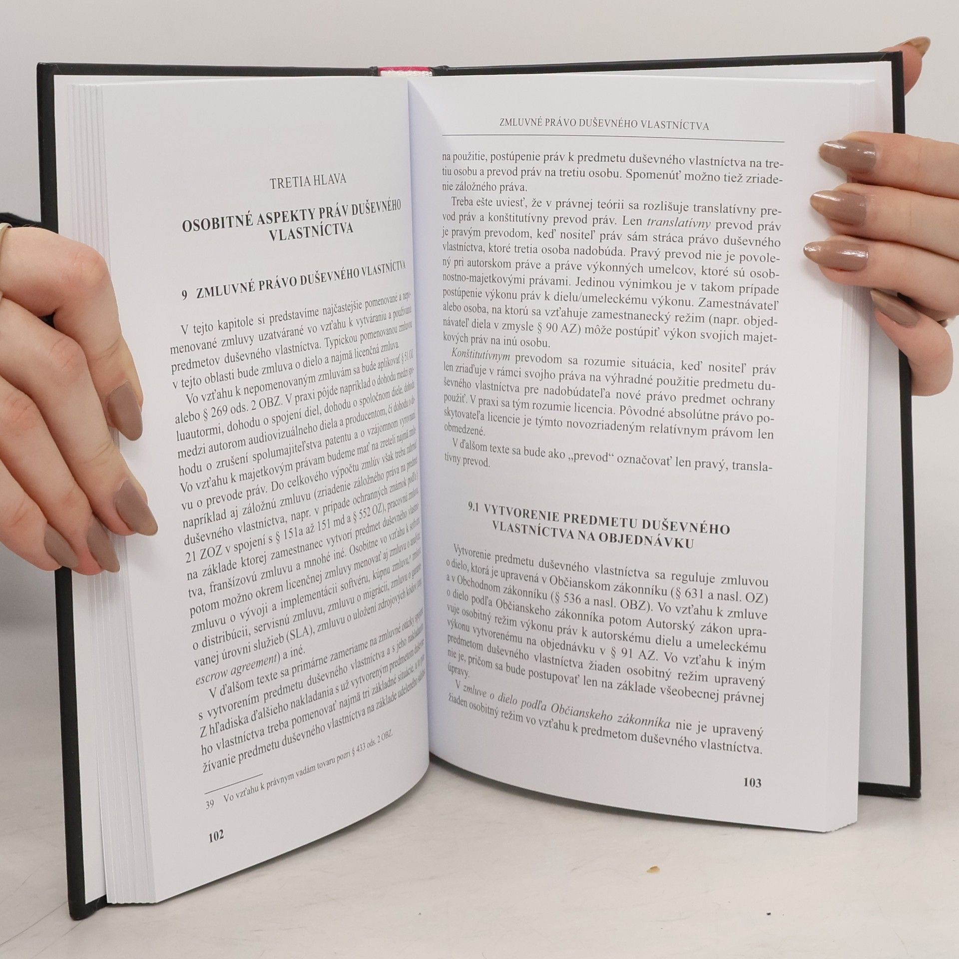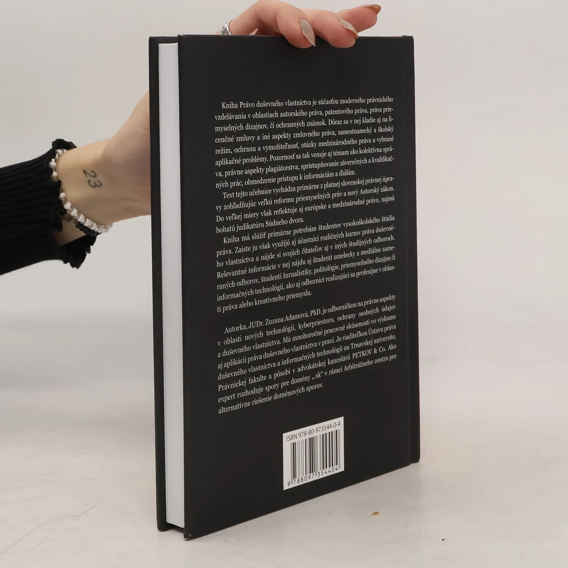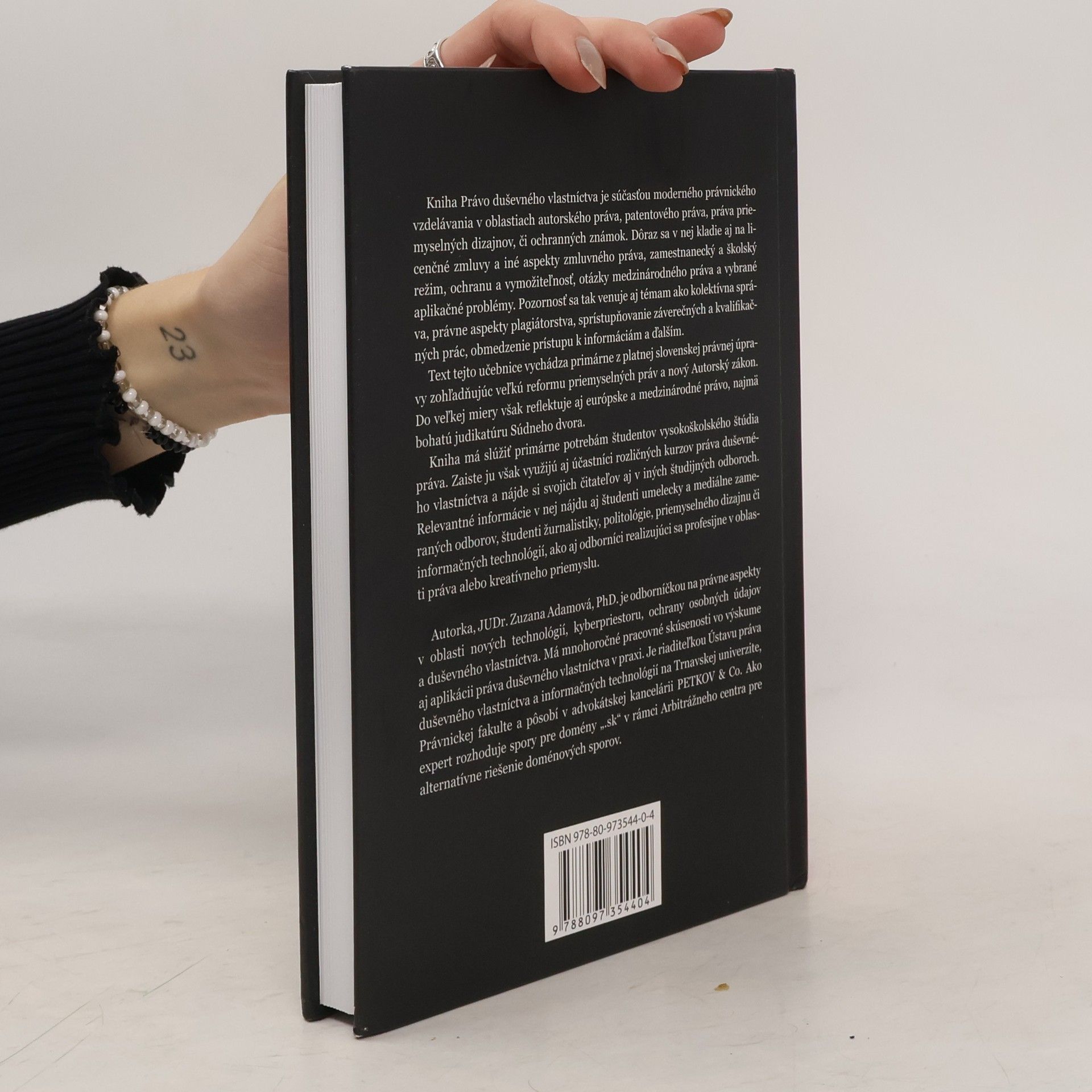Autorské, patentové, dizajnové, známkové právo a ďalšie oblasti práva duševného vlastníctva spracované moderným a pútavým spôsobom zohľadňujúcim platnú právnu úpravu aj relevantnú judikatúru. V knihe sú rozobraté témy ako napríklad licenčné zmluvy, zamestnanecký a školský režim, ochrana a vymožiteľnosť, otázky medzinárodného práva a vybrané aplikačné problémy. Pozornosť sa venuje aj kolektívnej správe práv, právnym aspektom plagiátorstva, sprístupňovaniu záverečných a kvalifikačných prác, obmedzeniu prístupu k informáciám a ďalším oblastiam. Kniha má slúžiť primárne potrebám študentov vysokoškolského štúdia práva, zaiste ju však využijú aj účastníci rozličných kurzov, študenti umelecky a mediálne zameraných odborov, študenti žurnalistiky, politológie, priemyselného dizajnu či informačných technológií, ako aj odborníci realizujúci sa profesijne v oblasti práva alebo kreatívneho priemyslu.