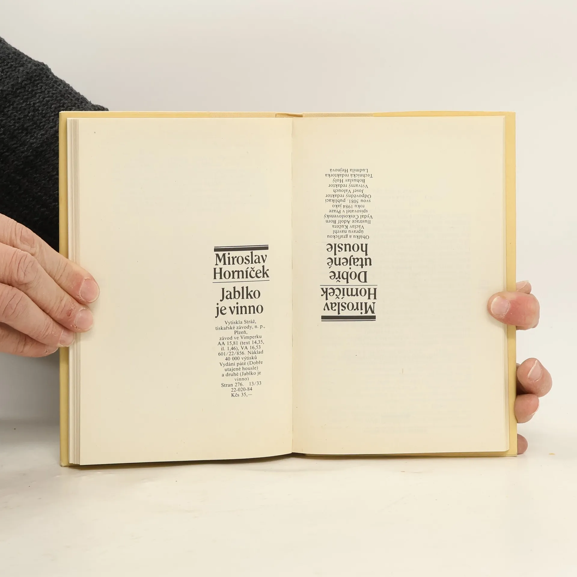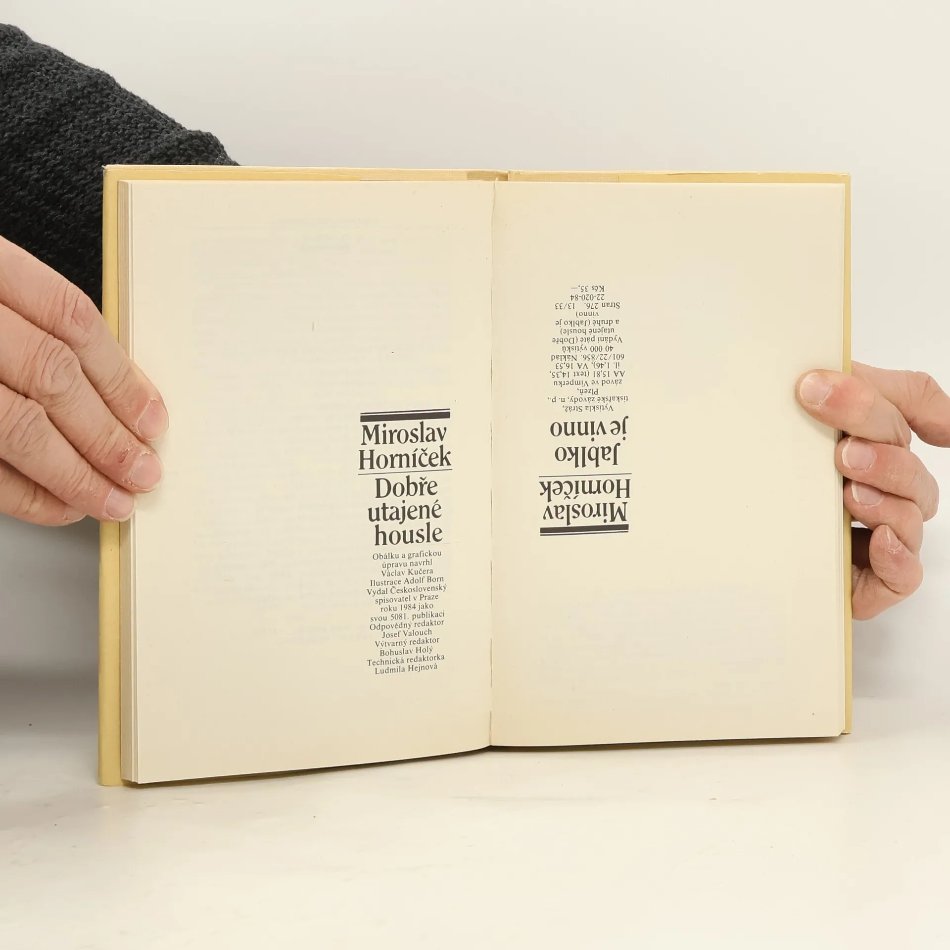 Oblíbený divadelní a filmový herec, dramatik a režisér Miroslav Horníček je rovnžě znám jako úspěšný prozaik. Dobře utajené housle, to je autorova prvotina, v níž v řadě rozmarných příhod z manželského soužití se zde čtenářům otevírá cesta k seznámení se s literárními kvalitami M. Horníčka. V tomhle svazku jde o 6. vydání. Jablko je vinno - jde o delší povídku, či novelu, v níž autor rozvíjí vtipné úvahy o povaze muže a ženy, velice bystře obnažuje přednosti i slabiny obou pohlaví, ústy své hrdinky Marty a z jejího ženského hlediska parafrázuje příběhy známých milostných dvojic - Oldřicha a Boženu, Ctirada a Šárky, Břetislava a Jitky, Sasona a Dalily, Orfea a Eurydiky. Jedná se o 3. vydání.