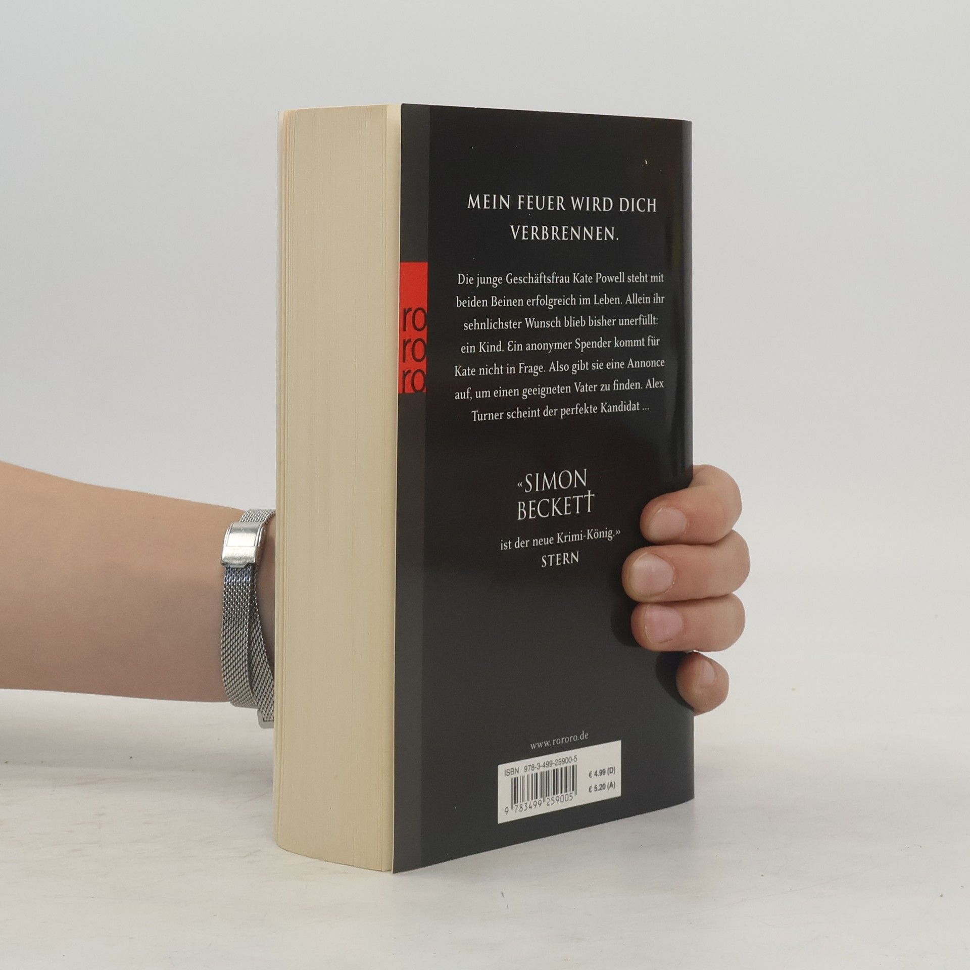 Mein Feuer wird dich verbrennen. Die junge Geschäftsfrau Kate Powell steht mit beiden Beinen erfolgreich im Leben. Allein ihr sehnlichster Wunsch blieb bisher unerfüllt: ein Kind. Ein anonymer Spender kommt für Kate nicht in Frage. Also gibt sie eine Annonce auf, um einen geeigneten Vater zu finden. Alex Turner scheint der perfekte Kandidat. «Simon Beckett ist der neue Krimi-König.» (Stern)