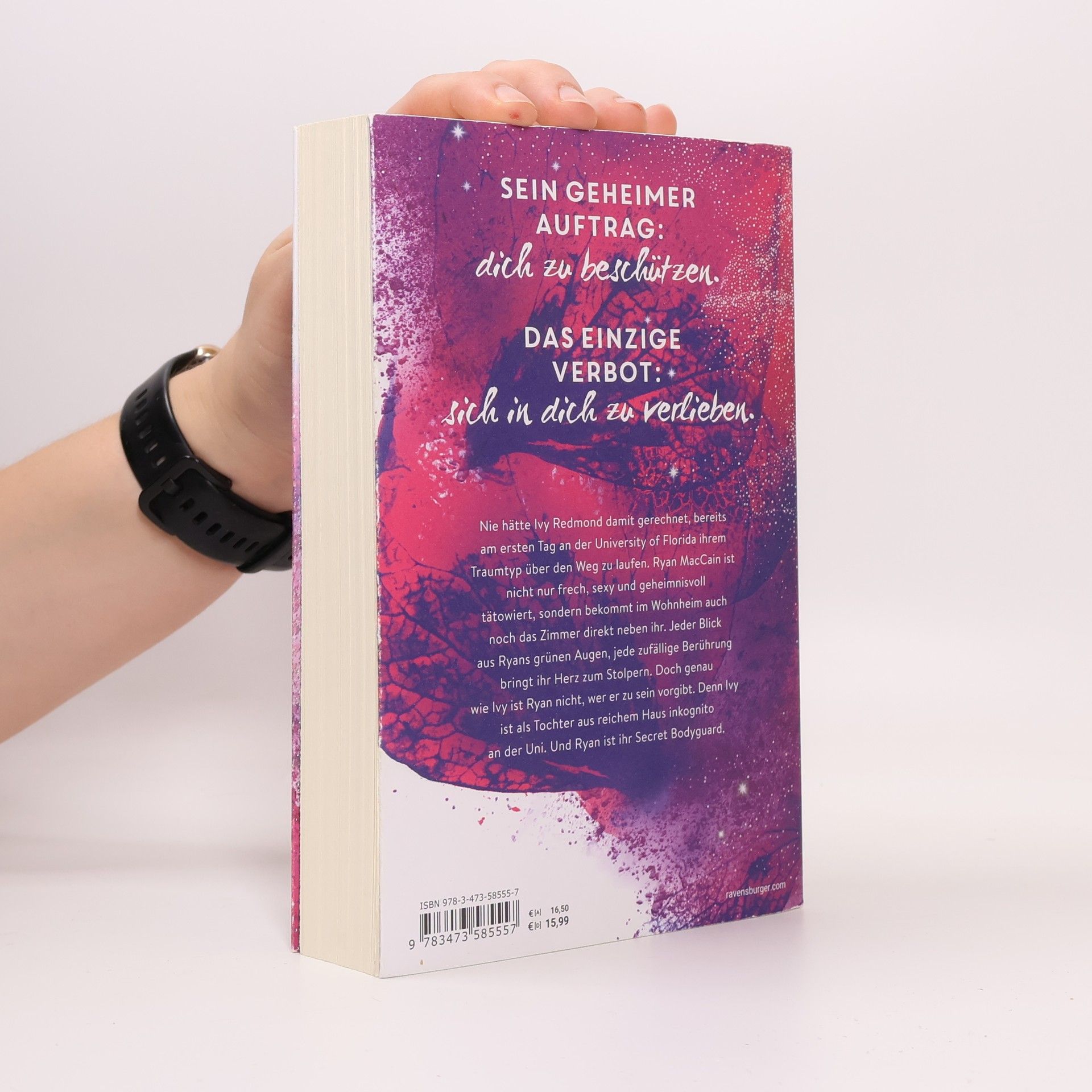Charmant. Unverschämt sexy. Prickelnd. Bodyguard-Romance at its best. Sein geheimer Auftrag: Dich zu beschützen. Das einzige Verbot: Sich in dich zu verlieben. Ivy Redmond trifft am ersten Tag an der University of Central Florida auf ihren Traumtypen, Ryan MacCain. Er ist nicht nur frech und sexy, sondern auch geheimnisvoll tätowiert und wohnt direkt neben ihr im Wohnheim. Jeder Blick aus seinen grünen Augen und jede zufällige Berührung lässt ihr Herz schneller schlagen. Doch sowohl Ivy als auch Ryan haben Geheimnisse. Ivy ist inkognito an der Uni, da sie aus reichem Haus stammt, und Ryan ist ihr Secret Bodyguard. In einer knisternden Szene wird die Spannung zwischen den beiden deutlich. Ivy spürt Ryans sehnsüchtigen Blick, während sie sich mit der Zunge über die Lippen fährt. Trotz des Verbots, sich zu verlieben, kann Ryan nicht widerstehen. Er gesteht, dass die Wahrscheinlichkeit hoch ist, dass er nicht mehr von ihr lassen kann, wenn er einmal anfängt. Ivy, verführt von der Nähe und der Anziehung, bittet ihn schließlich, sie zu küssen – nur noch einmal. Die Situation wird brenzlig, besonders wenn Ivys Vater auftaucht.