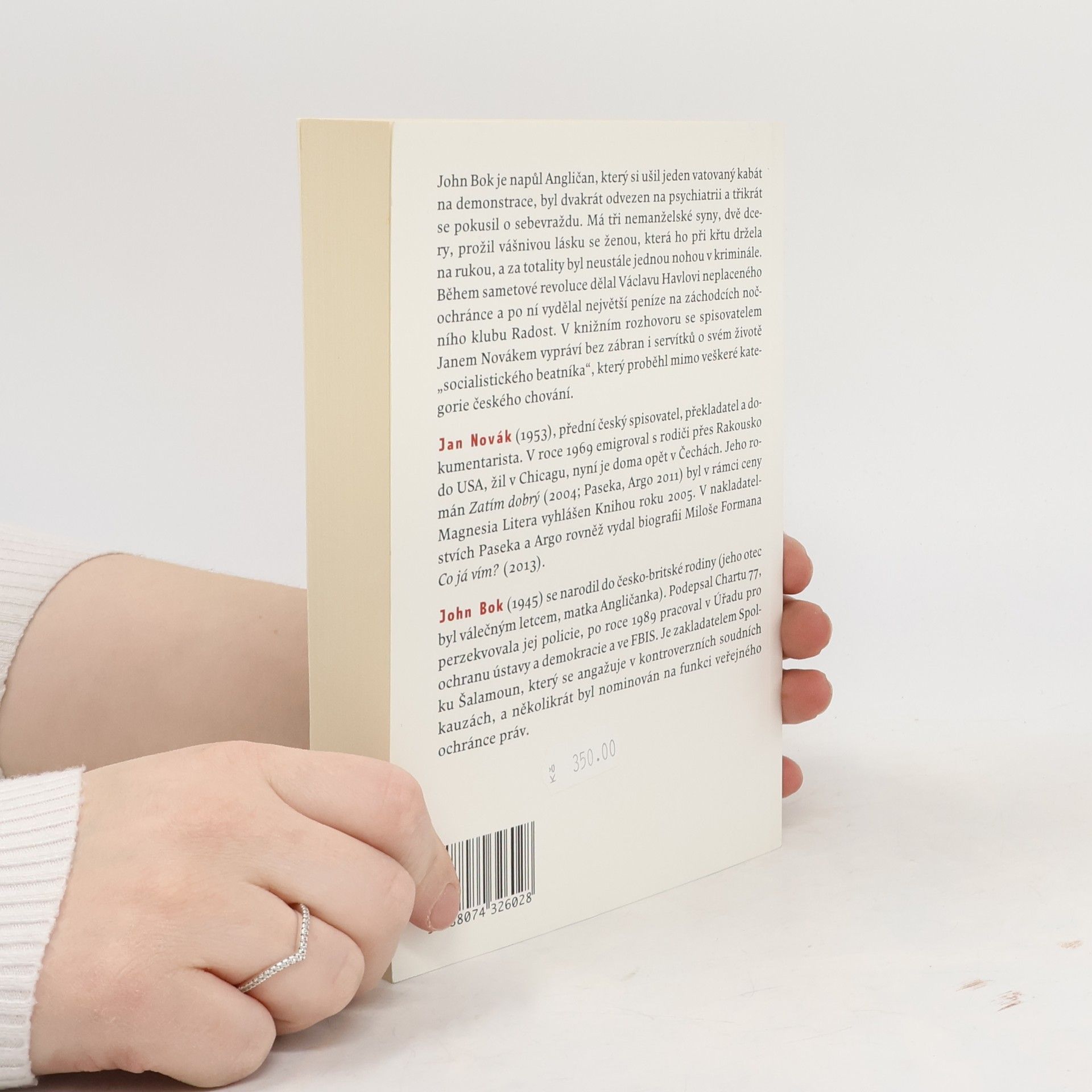 John Bok je napůl Angličan, který si ušil jeden vatovaný kabát na demonstrace, byl dvakrát odvezen na psychiatrii a třikrát se pokusil o sebevraždu. Má tři nemanželské syny, dvě dcery, prožil vášnivou lásku se ženou, která ho při křtu držela na rukou, a za totality byl neustále jednou nohou v kriminále. Během sametové revoluce dělal Václavu Havlovi neplaceného ochránce a po ní vydělal největší peníze na záchodcích nočního klubu Radost. V knižním rozhovoru se spisovatelem Janem Novákem vypráví bez zábran i servítků o svém životě "socialistického beatnika", který proběhl mimo veškeré kategorie českého chování. Jan Novák (1953) je přední český spisovatel, překladatel a dokumentarista. V roce 1969 emigroval s rodiči přes Rakousko do USA, žil v Chicagu, nyní je doma opět v Čechách. Jeho román Zatím dobrý (2004, Paseka, Argo 2011) byl v rámci ceny Magnesia Litera vyhlášen Knihou roku 2005. John Bok (1945) se narodil do česko-britské rodiny (jeho otec byl válečným letcem, matka Angličanka). Podepsal Chartu 77, byl perzekuován policií, po roce 1989 pracoval v Úřadu pro ochranu ústavy a demokracie a ve FBIS. Je zakladatelem Spolku Šalamoun, který se angažuje v kontroverzních soudních kauzách, a několikrát byl nominován na funkci veřejného ochránce práv.