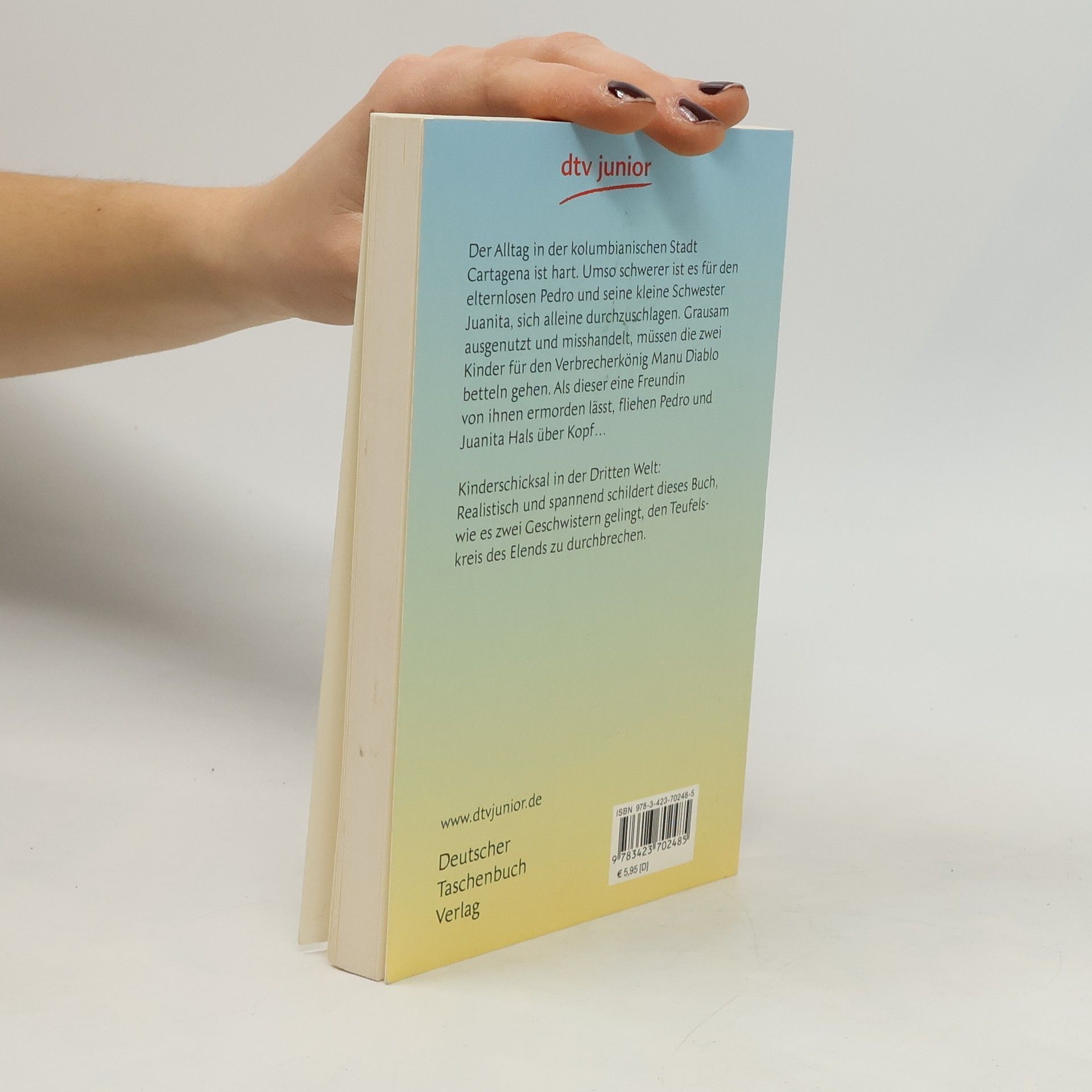 Der Alltag in der kolumbianischen Stadt Cartagena ist hart. Umso schwerer ist es für den elternlosen Pedro und seine kleine Schwester Juanita, sich alleine durchzuschlagen. Grausam ausgenutzt und misshandelt, müssen die zwei Kinder für den Verbrecherkönig Diablo betteln gehen. Als dieser eine Freundin von ihnen ermorden lässt, fliehen Pedro und Juanita Hals über Kopf... Kinderschicksal in der dritten Welt: Realistisch und spannend schildert dieses Buch, wie es zwei Geschwistern gelingt, den Teufelskreis des Elends zu durchbrechen.