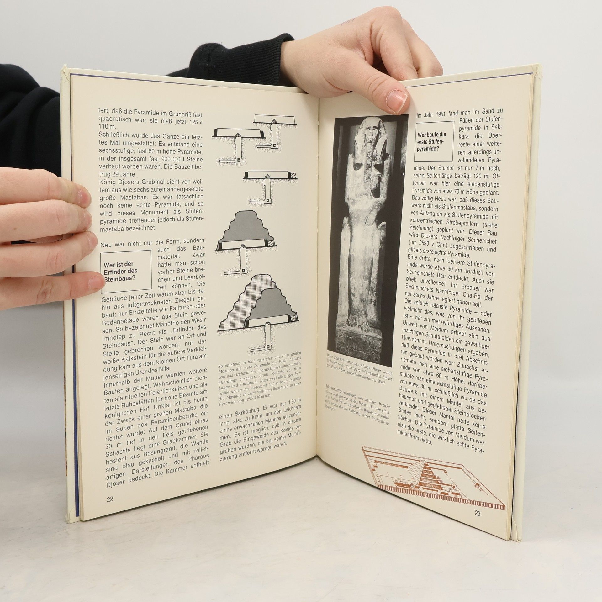 Vor fast 5000 Jahren entstand die erste ägyptische Pyramide - ein riesiges Grabmal aus Stein für einen Pharao. Zwei Jahrhunderte folgten die ägyptischen Könige dem Beispiel des ersten Pyramidenbauers Djoser. In diesem verhältnismäßig kurzen Zeitraum entstanden die großen Pyramiden, welche die Touristen noch heute am Ufer des Nils bestaunen können. Wie die Ägypter Pyramiden bauten und wie eine Pyramide im Inneren aussieht, ist aus diesem Band zu erfahren. Wie man die Hieroglyphen entzifferte, die erst die Erforschung des ägyptischen Altertums ermöglichten, ist ebenso Thema wie der Totenkult, die Götter und wo es außer in Ägypten sonst noch Pyramiden gibt.
