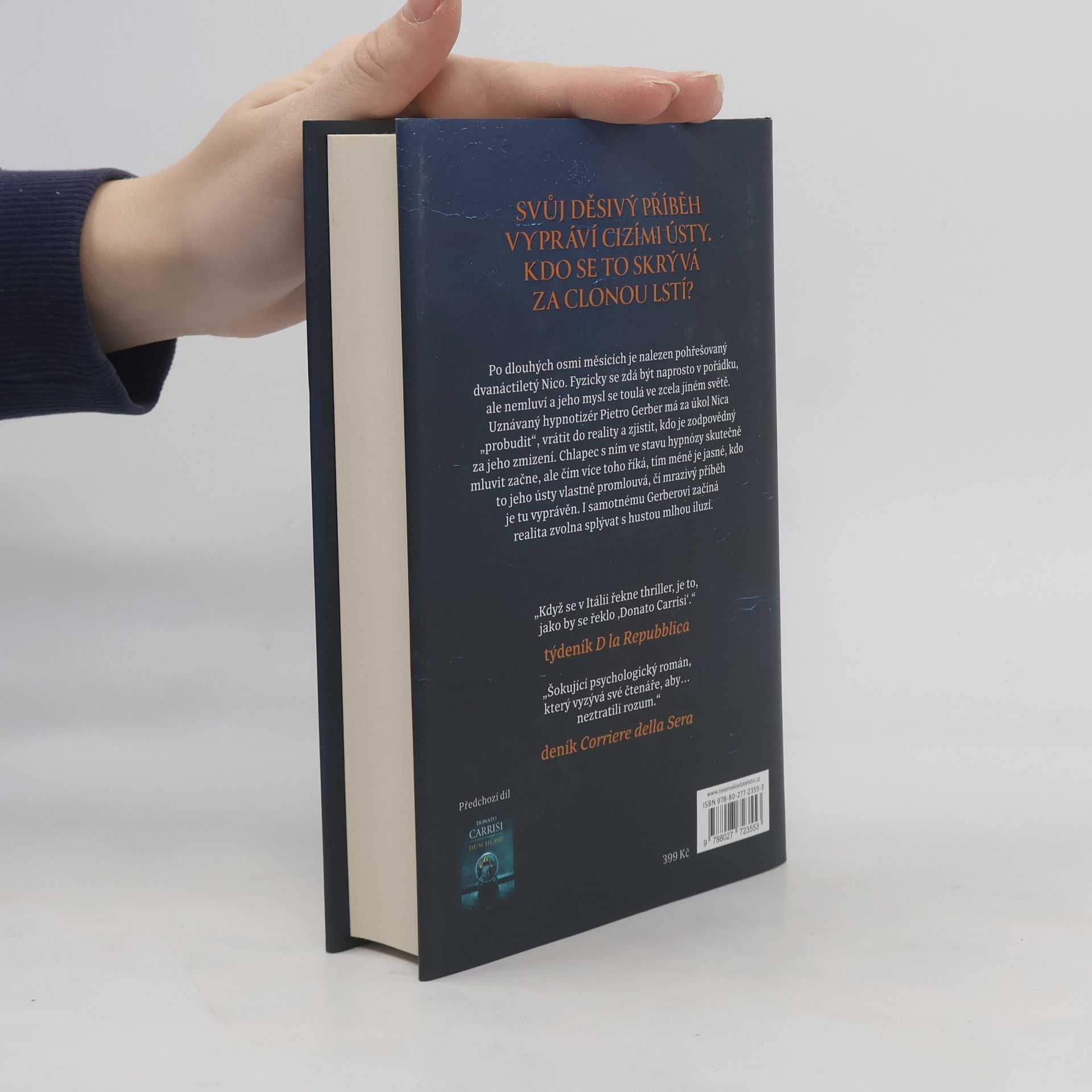 Psychologický thriller s detektivní zápletkou představuje druhý případ, na jehož šetření spolupracuje psycholog Pietro Gerber. Dvanáctiletý chlapec, který byl osm měsíců nezvěstný, se náhle objeví, a z jeho příběhu mrazí. V lese Pekelného údolí je nalezen zmizelý chlapec, když už v to nikdo nedoufal. Nicovi je dvanáct let a zdá se, že je v pořádku: někdo ho krmil, šatil, staral se o něj. Ale není možné zjistit, kdo to byl, protože Nico nemluví. Jeho vědomí je jako potemnělý dům, do něhož zdánlivě nelze proniknout. Jediný, kdo by ho dokázal probudit, je uspávač dětí. Pietro Gerber, nejlepší hypnotizér ve Florencii, je povolán, aby prozkoumal Nicovu mysl a zjistil, co se mu stalo. A jakkoli se to zdá nemožné, Gerber to zvládne. Podaří se mu odhalit spouštěč, který v Nicovi cosi uvede do chodu. Jenže když chlapcův hlas začne vyprávět příběh, Pietro Gerber pozná, že otevřel dveře zapomenutého pokoje. Chápe, že mu na záchranu Nica nezbývá moc času, a brzy se ocitne uvězněný ve spleti iluzí a lstí. Protože zhypnotizovaný hlas patří tomu chlapci. Ale příběh, který vypráví, je někoho jiného. Nakladatelská anotace.