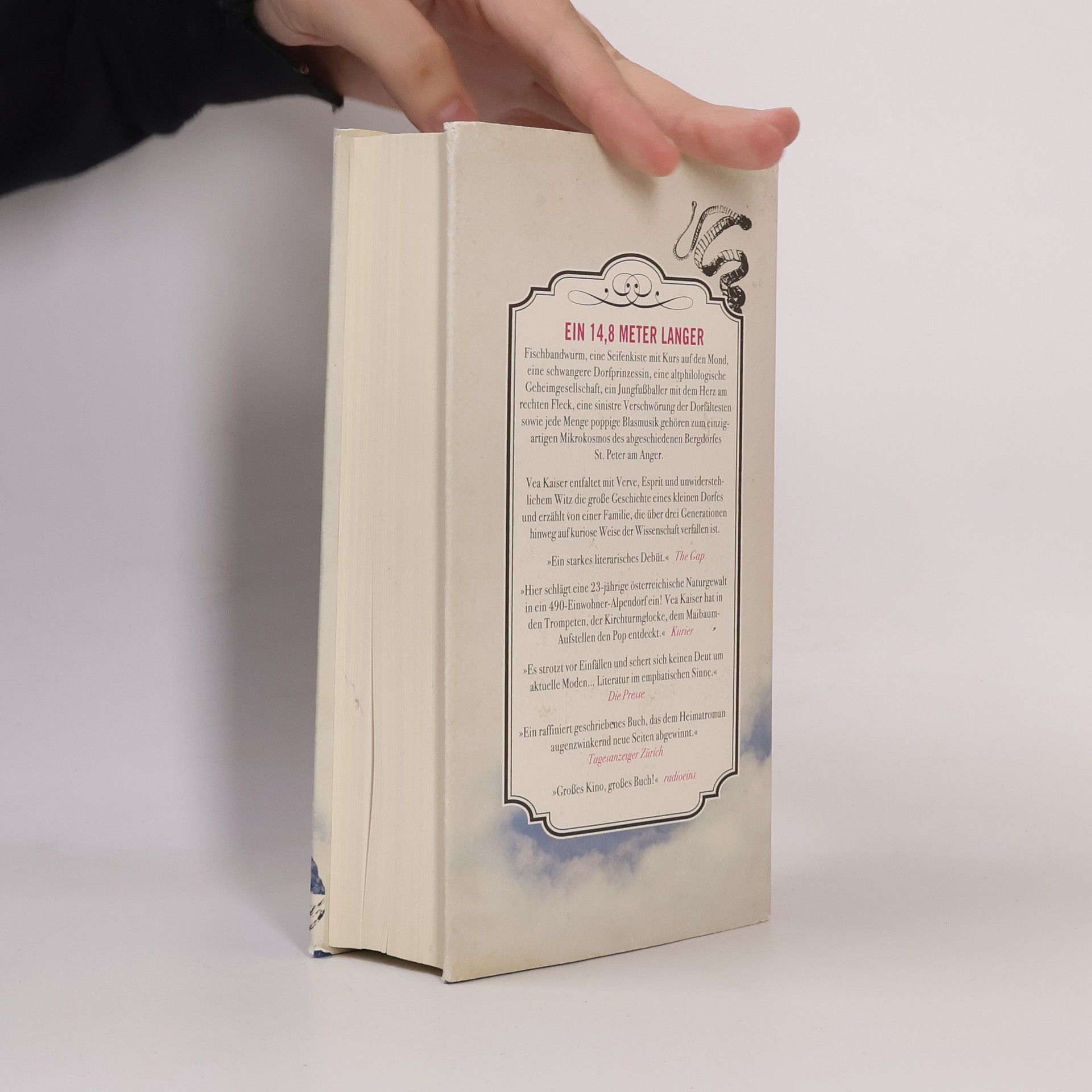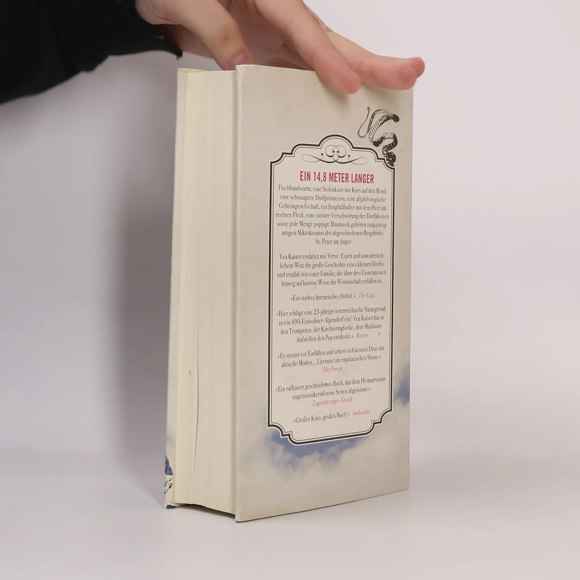 In ihrem Debütroman entfaltet Vea Kaiser mit großer Verve und Witz die Welt des abgeschiedenen alpenländischen Bergdorfes St. Peter am Anger und erzählt die Geschichte einer Familie, die über drei Generationen hinweg der Wissenschaft verfallen ist. Johannes A. Irrwein, geprägt von seinem Großvater, dem Bandwurmforscher, hegt eine Abneigung gegen die Engstirnigkeit der St. Petrianer. Bildungshungrig sehnt er sich nach der aufgeklärten Welt hinter den Alpen. Als er jedoch unerwartet durch die Matura fällt, beginnt er, sich mit seinem Dorf auseinanderzusetzen. Inspiriert von seinem Lieblingsautor Herodot, macht er sich daran, die Chroniken seines Dorfes zu verfassen, was ungewollt das größte Ereignis in der Geschichte St. Peters auslöst. Ein 14,8 Meter langer Fischbandwurm, eine Seifenkiste auf dem Weg zum Mond, ein attraktiver Mönch im Jaguar und eine schwangere Dorfprinzessin sind nur einige der skurrilen Elemente, die diesen einzigartigen Mikrokosmos prägen. Mit Liebe zu leuchtenden Details, erzählerischem Furor und Vielstimmigkeit besticht dieser Roman. Vea Kaiser gelingt mit dreiundzwanzig Jahren ein wagemutiges, herausragendes Debüt, das verzaubert.