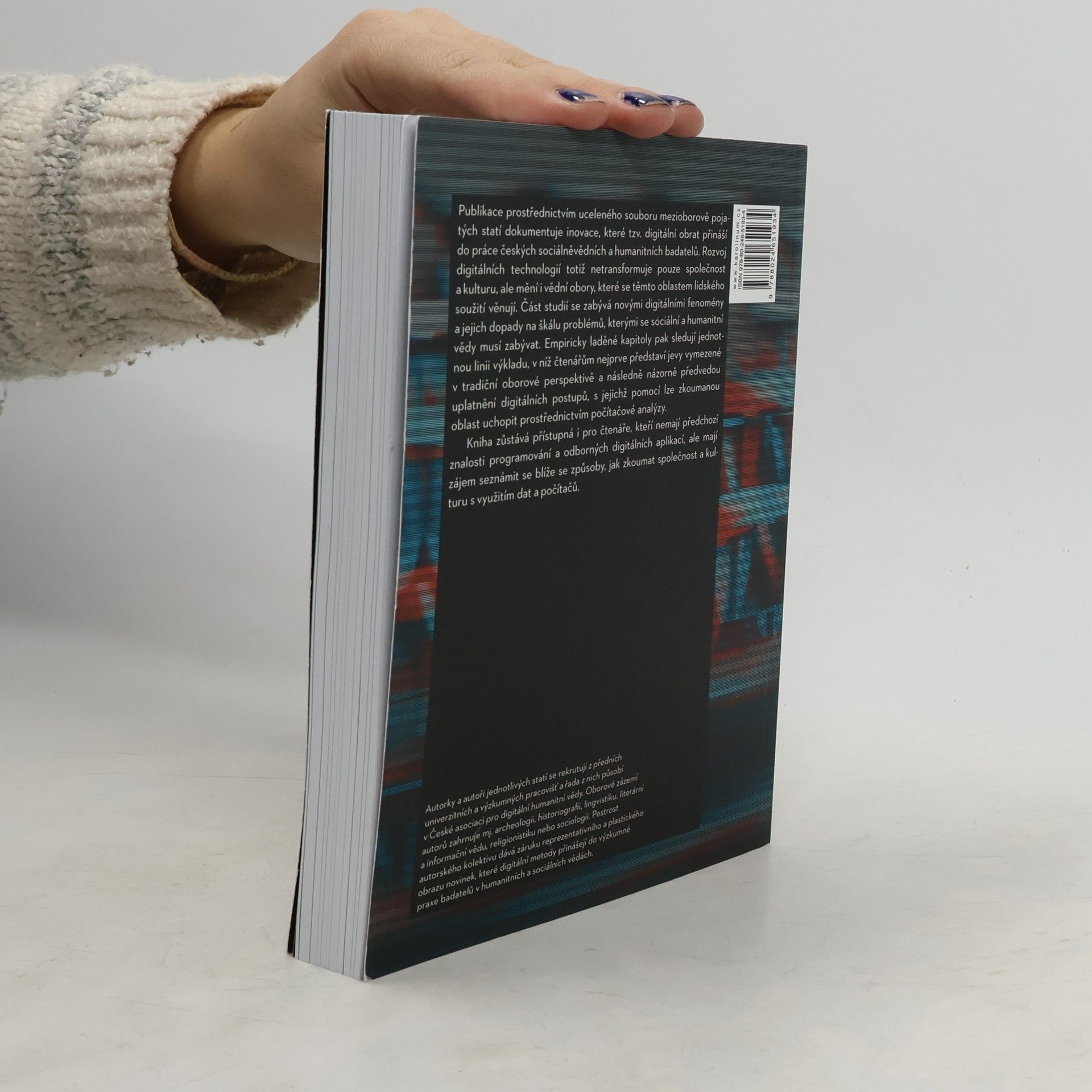 Publikace prostřednictvím uceleného souboru mezioborově pojatých statí dokumentuje inovace, které tzv. digitální obrat přináší do práce českých sociálněvědních a humanitních badatelů. Rozvoj digitálních technologií totiž netransformuje pouze společnost a kulturu, ale mění i vědní obory, které se těmto oblastem lidského soužitívěnují. Část studií se zabývá novými digitálními fenomény a jejich dopady na škálu problémů, kterými se sociální a humanitní vědy musí zabývat. Empiricky laděné kapitoly pak sledují jednotnou linii výkladu, v níž čtenářům nejprve představí jevy vymezené v tradiční oborové perspektivě a následně názorně předvedou uplatnění digitálních postupů, s jejichž pomocí lze zkoumanou oblast uchopit prostřednictvím počítačové analýzy. Kniha zůstává přístupná i pro čtenáře, kteří nemají předchozí znalosti programování a odborných digitálních aplikací, ale mají zájem seznámit se blíže se způsoby, jak zkoumat společnost a kulturu s využitím dat a počítačů.