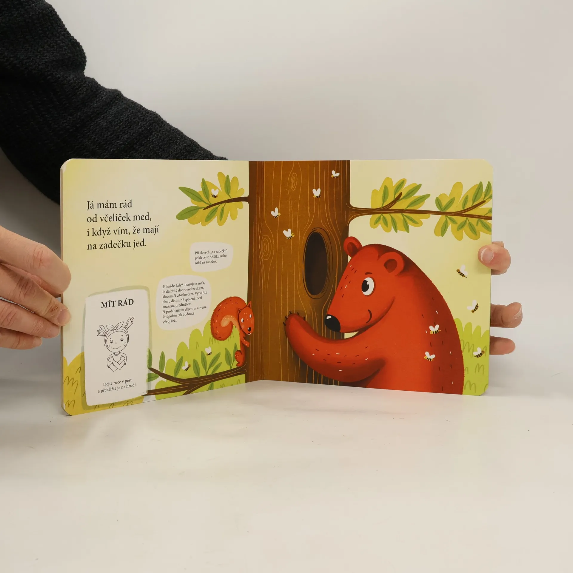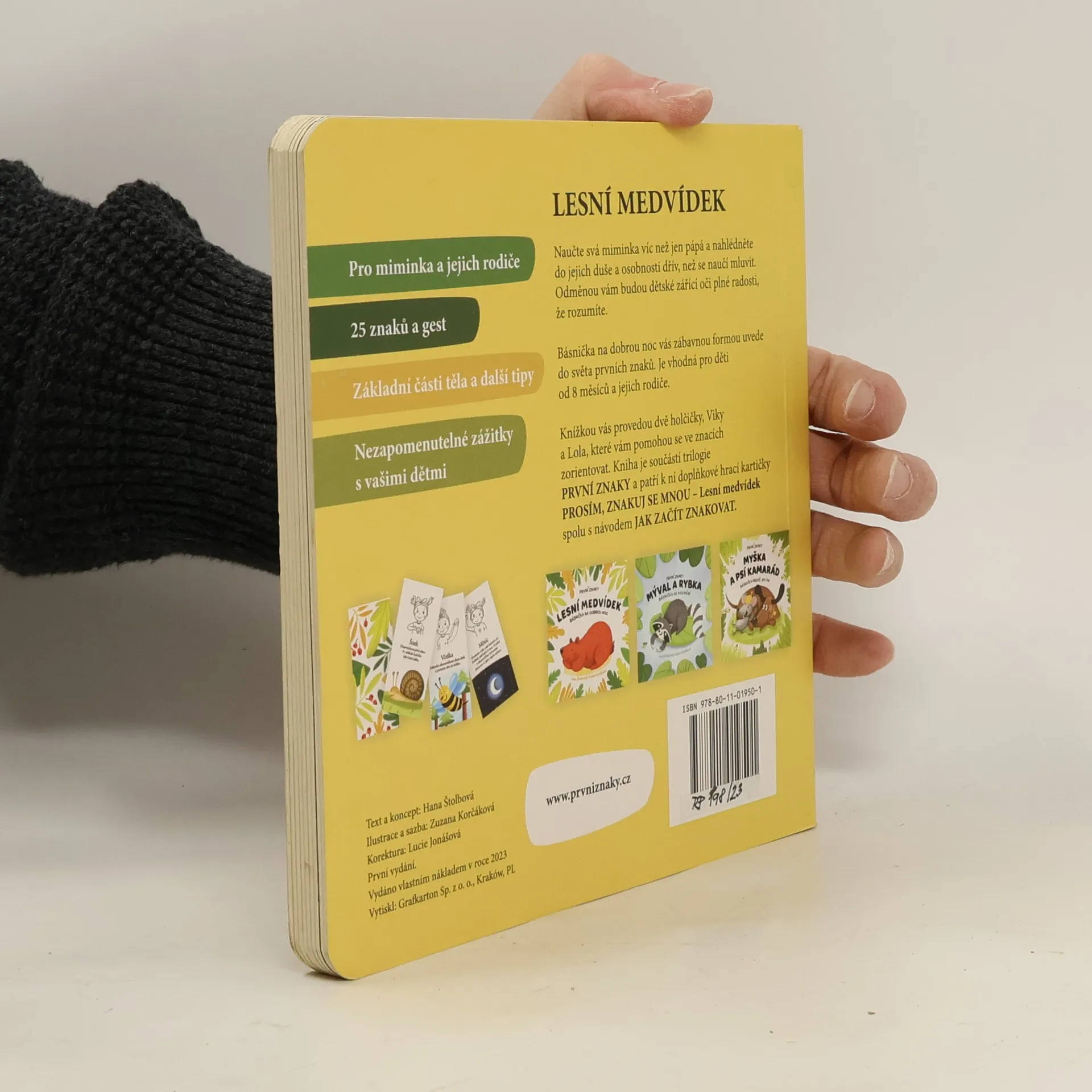 Krátký veršovaný příběh o lesním medvídkovi, který nade vše miluje med, ale získat ho vždycky něco stojí. A co se dozvíte navíc? Kromě krásné básničky na dobrou noc se naučíte ukázat znakem některá lesní zvířátka, 5 veledůležitých sloves, co všechno můžeme najít na obloze, na kterou se miminko z kočárku nejčastěji dívá, a navíc si procvičíte, kde najdete jaké části těla. Naučte se s vaším miminkem vzájemnému porozumnění a užijte si s mou knížkou spoustu krásných společných chvil. Interaktivní leporelo je určeno pro nejmenší děti od 8. měsíců. Má pevné a silné stránky, jimž nehrozí poškození a zaoblené rohy jako prevence proti poranění. Každá jednotlivá stránka obsahuje znaky a tipy, které podněcují malého čtenáře i rodiče k akci. Celkem je zde uvedeno 25 znaků a gest.