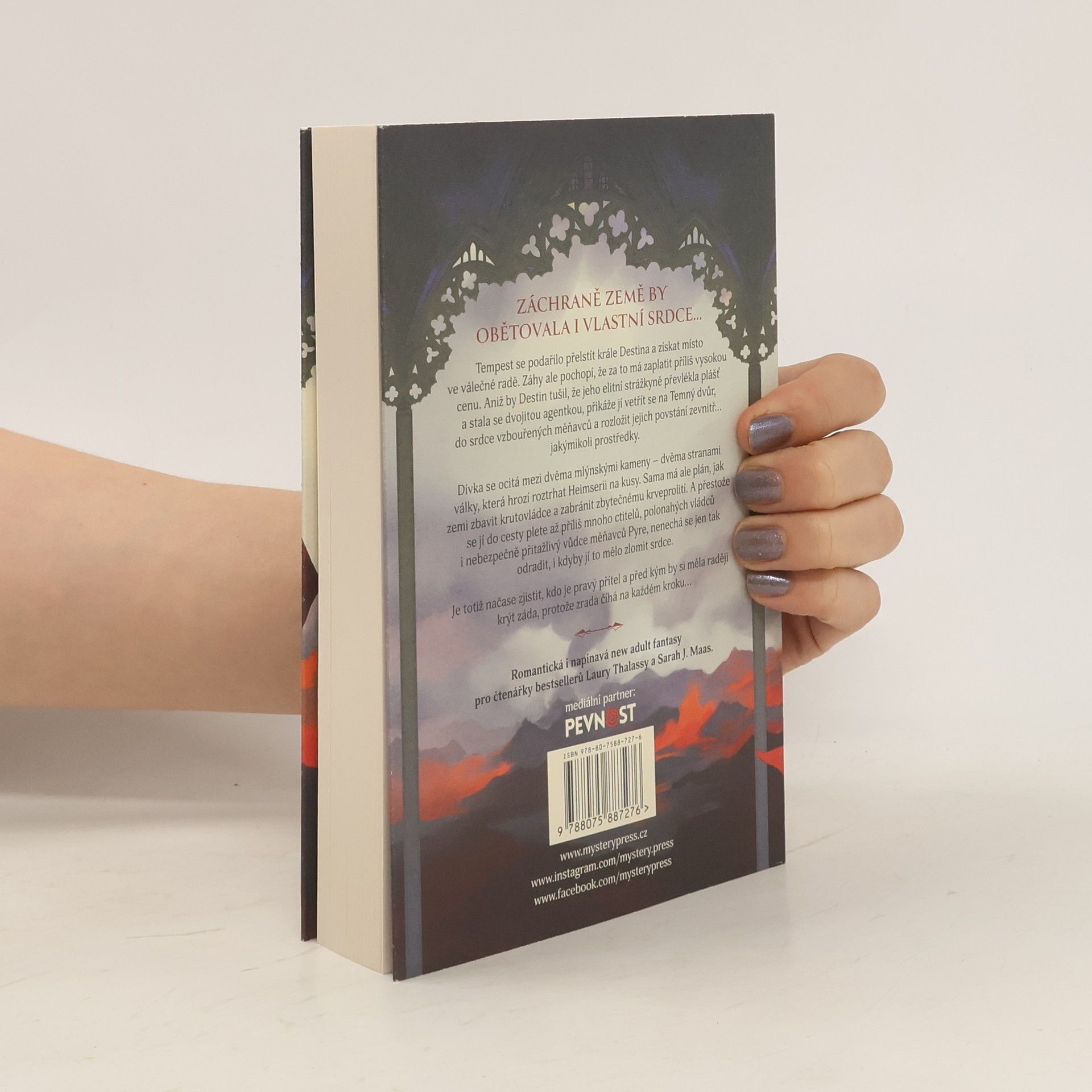 CESTA OHAŘKY TEMPEST JE ZBROCENÁ KRVÍ, PLNÁ MRTVÝCH TĚL A STŘEPŮ JEJÍHO SRDCE... Tempest se podařilo přelstít krále Destina a získat místo ve válečné radě. Záhy ale pochopí, že za to má zaplatit příliš vysokou cenu. Aniž by Destin tušil, že jeho elitní strážkyně převlékla plášť a stala se dvojitou agentkou, přikáže jí vetřít se na Temný dvůr, do srdce vzbouřených měňavců a rozložit jejich povstání zevnitř… jakýmikoli prostředky. Dívka se ocitá mezi dvěma mlýnskými kameny – dvěma stranami války, která hrozí roztrhat Heimserii na kusy. Sama má ale plán, jak zemi zbavit krutovládce a zabránit zbytečnému krveprolití. A přestože se jí do cesty plete až příliš mnoho ctitelů, polonahých vládců i nebezpečně přitažlivý vůdce měňavců Pyre, nenechá se jen tak odradit, i kdyby jí to mělo zlomit srdce. Je totiž načase zjistit, kdo je pravý přítel a před kým by si měla raději krýt záda, protože zrada číhá na každém kroku…