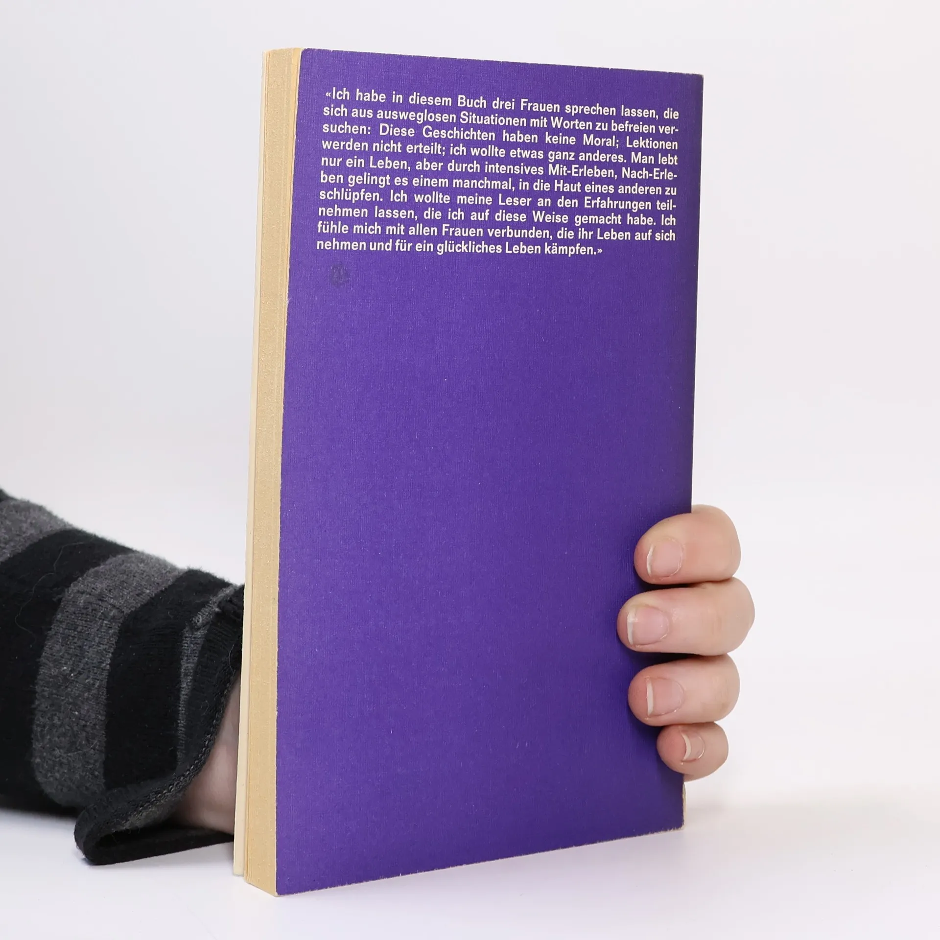 «Ich habe in diesem Buch drei Frauen sprechen lassen, die sich aus ausweglosen Situationen mit Worten zu befreien versuchten: Diese Geschichten haben keine Moral; Lektionen werden nicht erteilt; ich wollte etwas ganz anderes. Man lebt nur ein Leben, aber durch intensives Mit-Erleben, Nach-Erleben gelingt es einem manchmal, in die Haut eines anderen zu schlüpfen. Ich wollte meine Leser an den Erfahrungen teilnehmen lassen, die ich auf diese Weise gemacht habe. Ich fühle mich mit allen Frauen verbunden, die ihr Leben auf sich nehmen und für ein glückliches Leben kämpfen.»