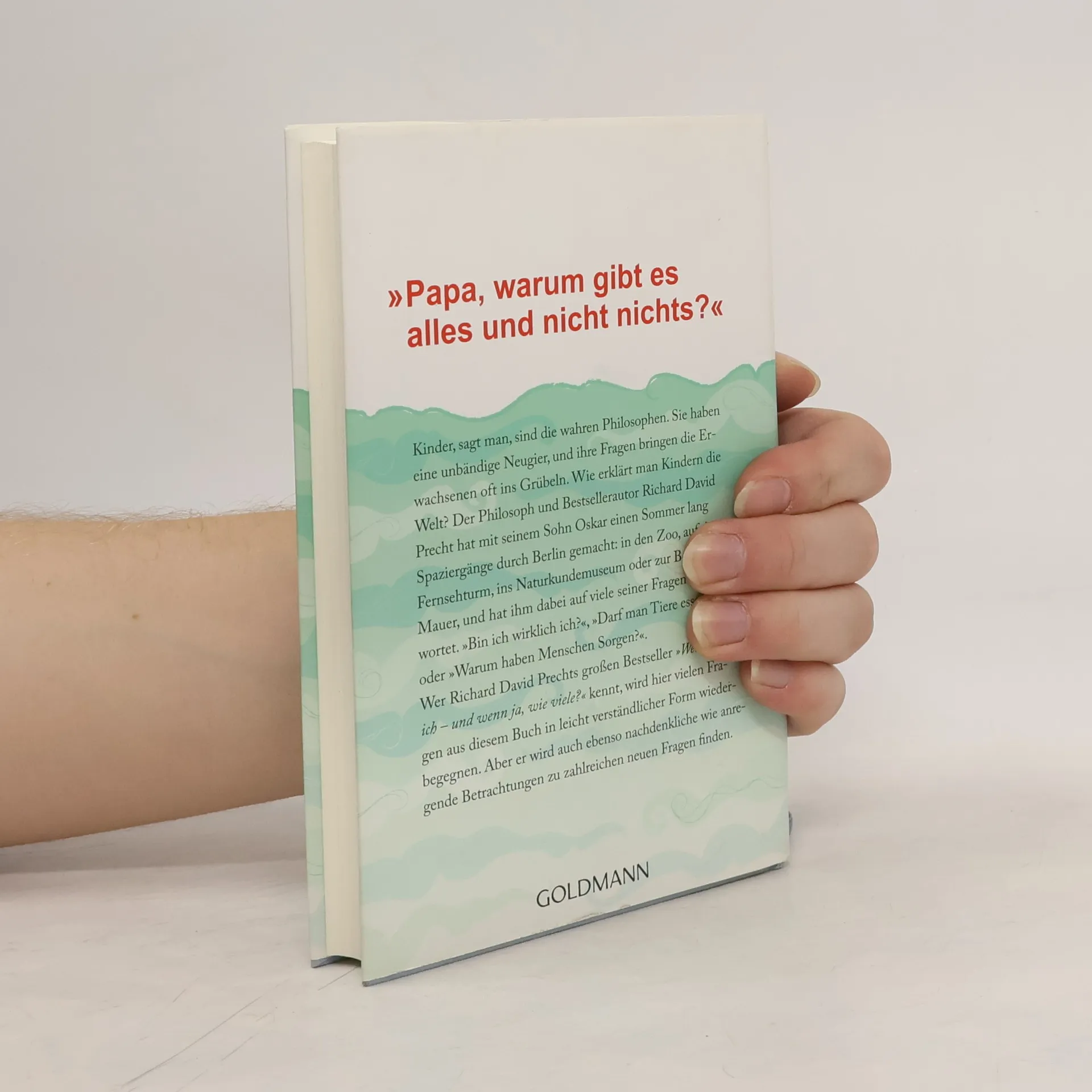 Richard David Precht erklärt seinem Sohn Oskar die Welt Kinder, sagt man, sind die wahren Philosophen. Sie haben eine unbändige Neugier, und ihre Fragen bringen die Erwachsenen oft ins Grübeln. Wie erklärt man Kindern die Welt? Der Philosoph und Bestsellerautor Richard David Precht hat mit seinem Sohn Oskar einen Sommer lang Spaziergänge durch Berlin gemacht: in den Zoo, auf den Fernsehturm, ins Naturkundemuseum oder zur Synagoge, und hat ihm dabei auf viele seiner Fragen geantwortet. „Bin ich wirklich ich?“, „Darf man Tiere essen?“ oder „Warum haben Menschen Sorgen?“. Auf spielerische Art und Weise und mit vielen Geschichten zeigt Precht den Kindern unsere Welt und hilft ihnen, sie besser zu verstehen. Nach „Wer bin ich und wenn ja, wie viele?“ nun das Buch zur Philosophie für alle jungen Menschen, die es genauer wissen wollen!