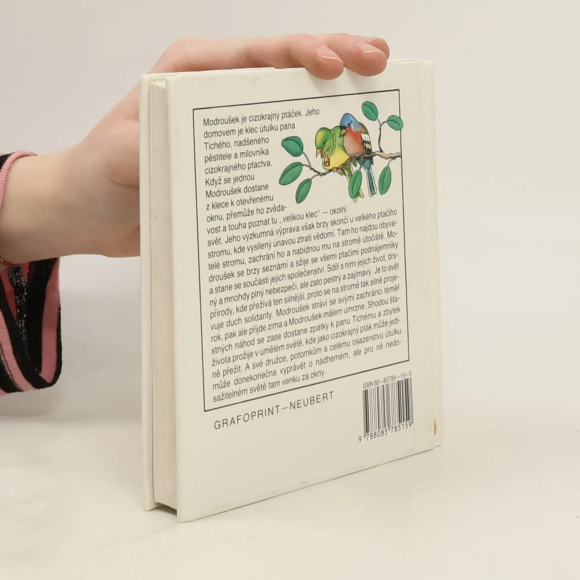 Malý modroušek, exotický ptáček, který v našich podmínkách přežívá jen těžko, uletí chovateli z klece a je zachráněn ptáčky z ptačího stromu, kteří tam pod dohledem starého laskavého papouška Kubíka žijí jako jedna velká rodina. Brhlíci, strakapoudi, zvonci, červenky a pěnice přijmou Modrouška mezi sebe, takže během léta zažije mnohá větší i menší dobrodružství, veselá i nebezpečná. Jeho očima se malí čtenáři dozvědí zajímavé podrobnosti o stavění ptačích hnízd, o lovu na housenky i o tom, jak to dopadne, když se v některém z hnízd nic netušícím ptačím rodičům vylíhne kukaččí mládě. S blížícím se podzimem však přijde chladnější počasí a Modroušek onemocní. Ptačí kamarádi o něj obětavě pečují. Podaří se křehkého ptáčka zachránit?