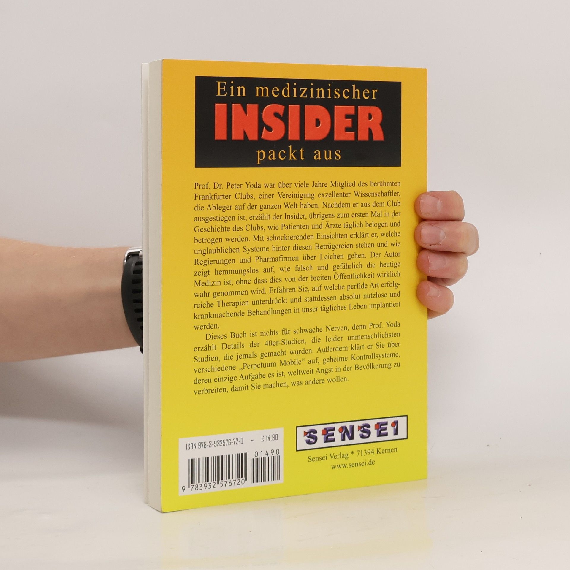 Prof. Dr. Peter Yoda war über viele Jahre Mitglied des berühmten Frankfurter Clubs, einer Vereinigung exzellenter Wissenschaftler, die Ableger auf der ganzen Welt haben. Nachdem er aus dem Club ausgestiegen ist, erzählt der Insider, übrigens zum ersten Mal in der Geschichte des Clubs, wie Patienten und Ärzte täglich belogen und betrogen werden. Mit schockierenden Einsichten erklärt er welche unglaublichen Systeme dahinter stehen und wie Regierungen und Pharmafirmen über Leichen gehen. Der Autor zeigt hemmunngslos auf auf, wie falsch und gefährlich die heutige Medizin ist, ohne dass dies von der breiten Öffentlichkeit wirklich wahr genommen wird. Erfahren Sie, auf welche perfide Art erfolgreiche Therapien unterdrückt und stattdessen absolut nutzlose und krankmachende in unser tägliches Leben implantiert werden. Dieses Buch ist nichts für schwache Nerven, denn Prof. Yoda erzählt Details der 40er Studien, die leider unmenschlichsten Studien die jemals gemacht wurden. Außerdem klärt er Sie über „Perpetuums Mobile“ auf, die von Regierungen und Firmen weltweit eingeführt wurden und deren einzige Aufgabe ist, Angst in der Bevölkerung zu verbreiten, damit Sie machen was andere wollen.