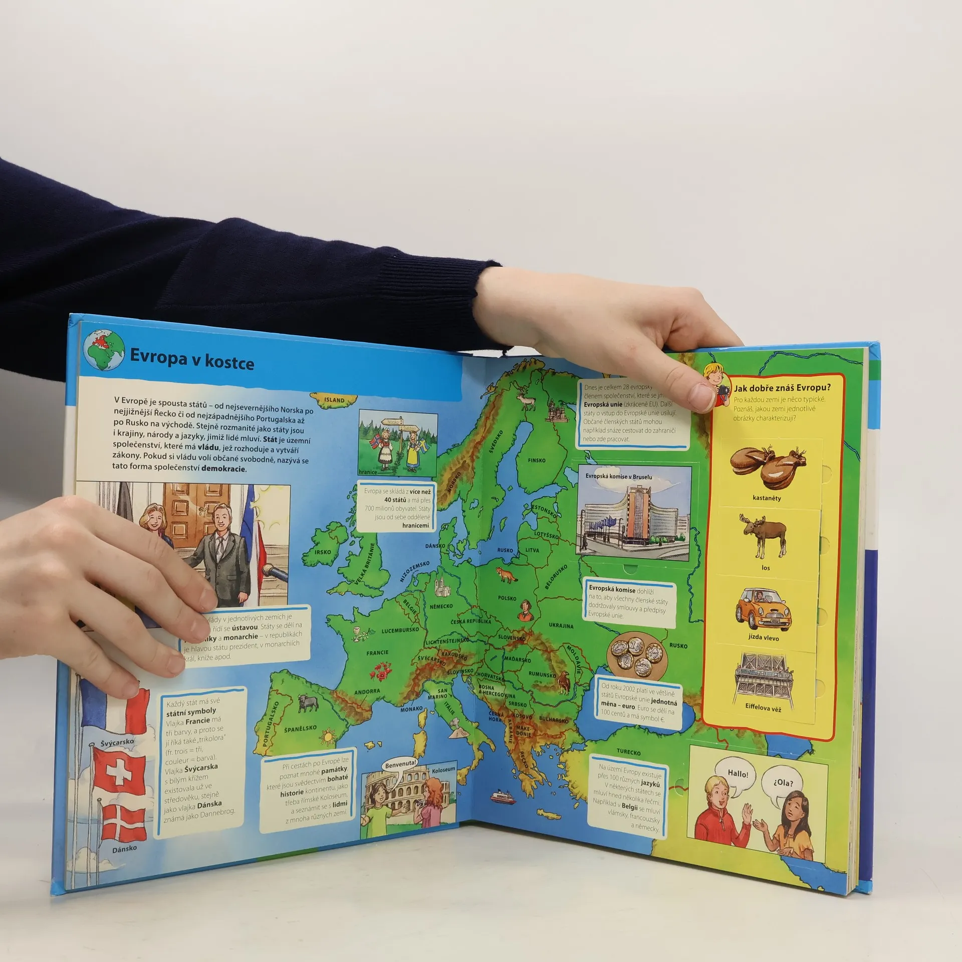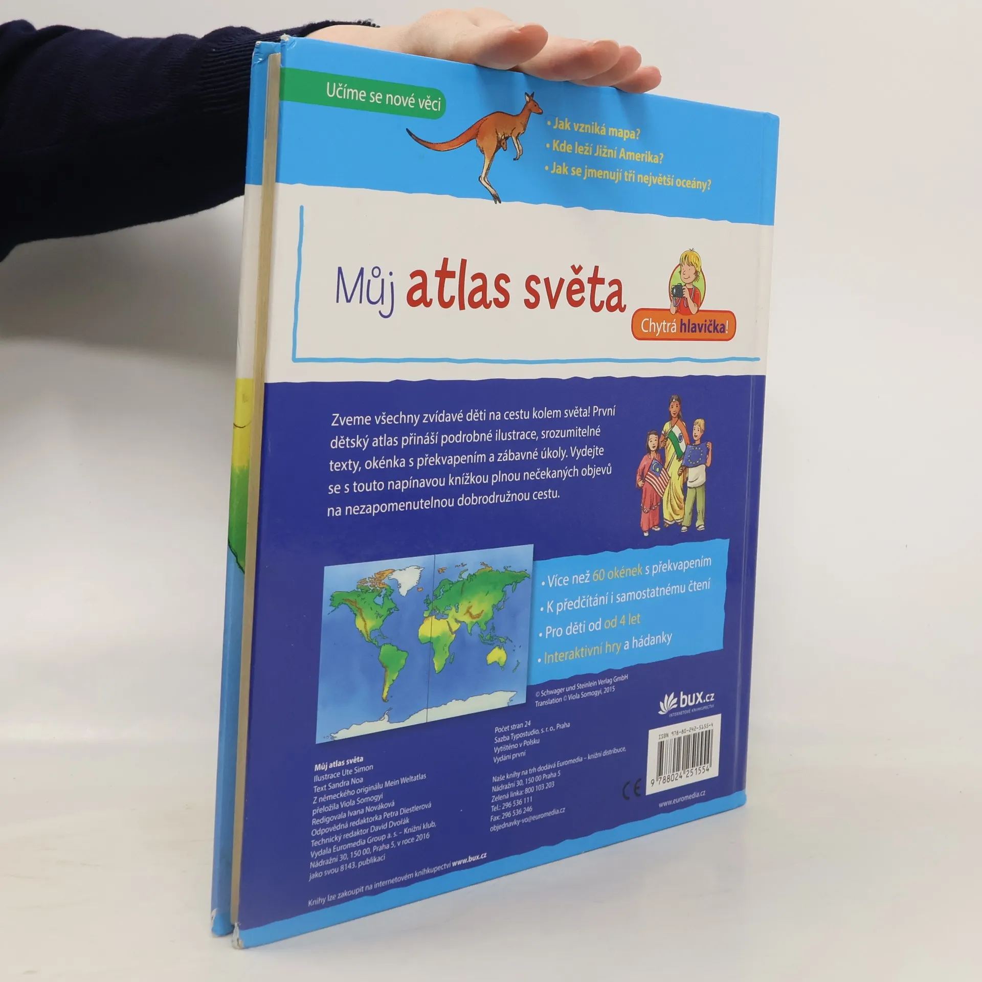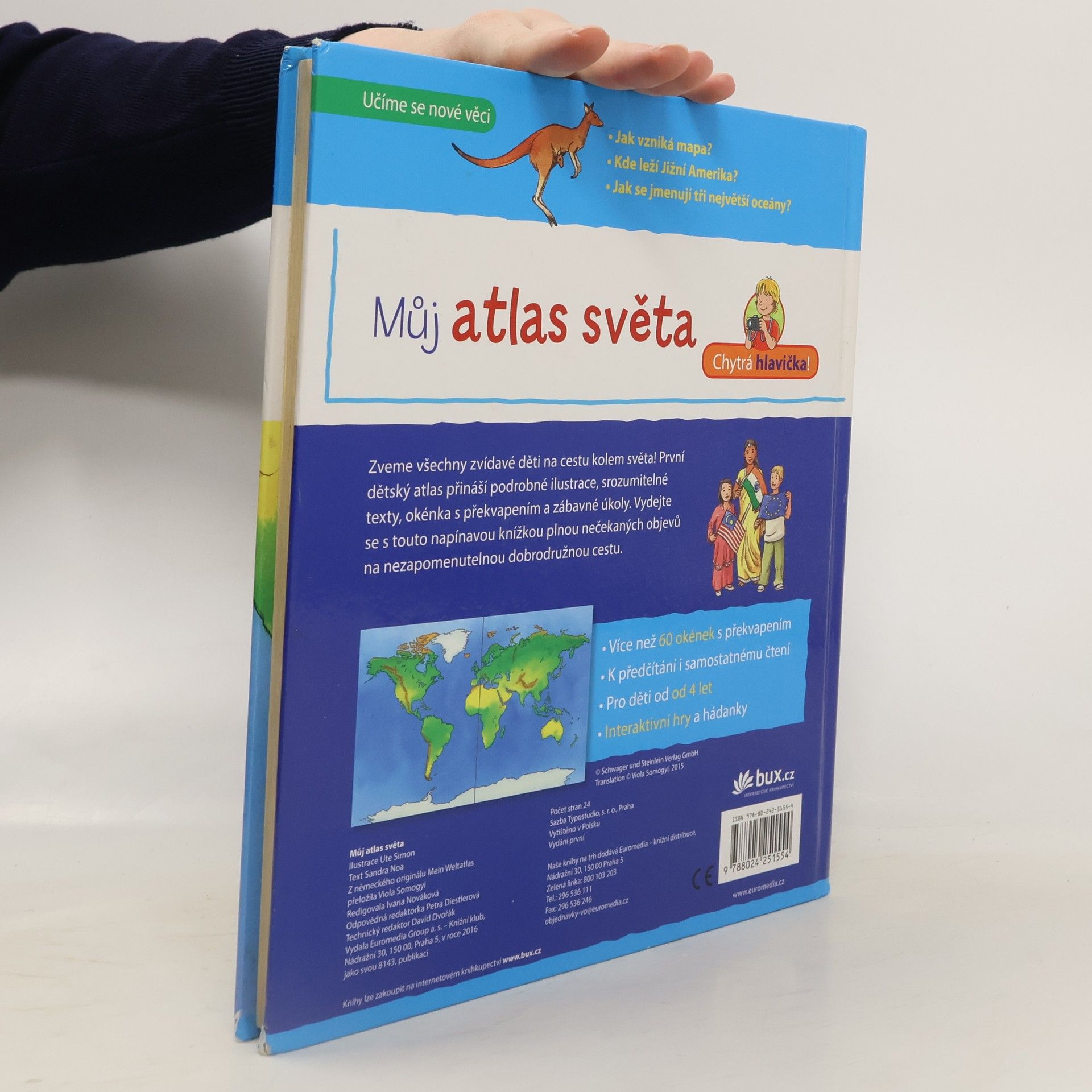 Atlas světa pro nejmenší obsahuje podrobné ilustrace a snadno srozumitelné naučné texty, které pomůžou dětem už od čtyř let poznávat a objevovat svět, v němž žijeme. Více než 60 odklápěcích okének, zábavné hry a hádanky z něj dělají užitečnou a zajímavou knížku k předčítání i k samostatnému zkoumání.