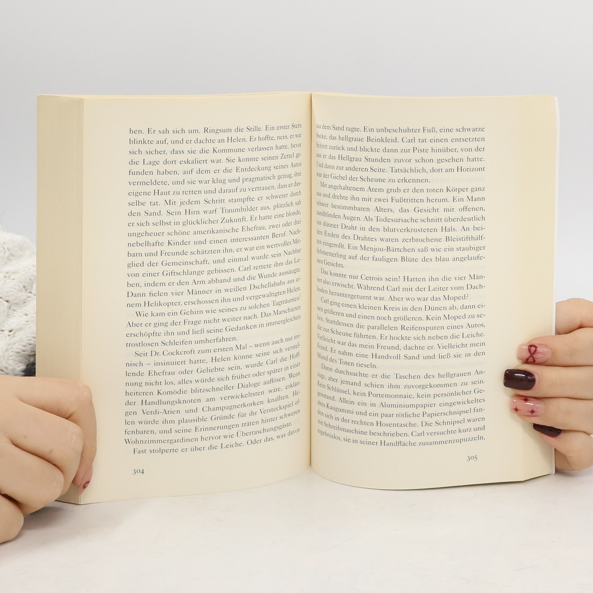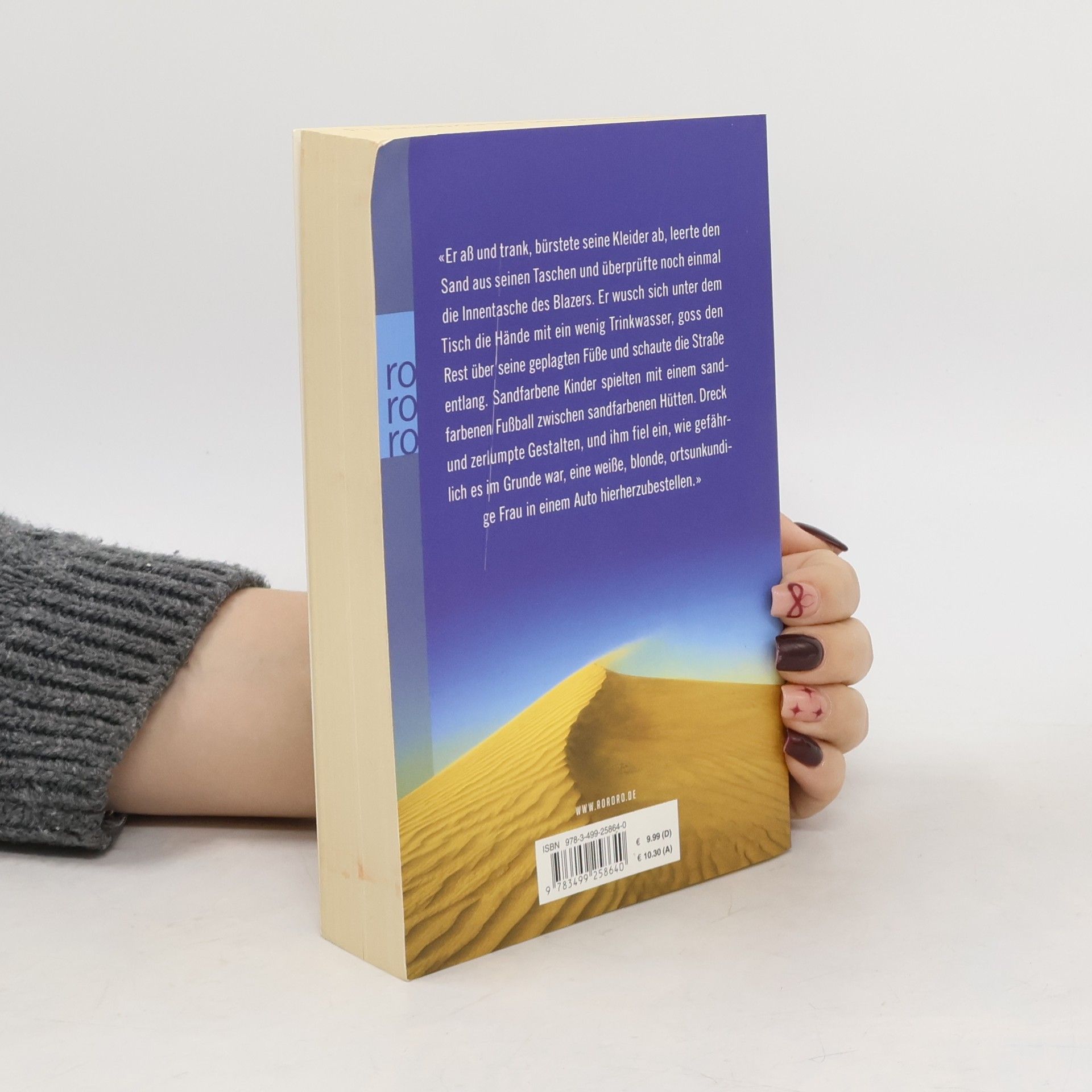 «Er aß und trank, bürstete seine Kleider ab, leerte den Sand aus seinen Taschen und überprüfte noch einmal die Innentasche des Blazers. Er wusch sich unter dem Tisch die Hände mit ein wenig Trinkwasser, goss den Rest über seine geplagten Füße und schaute die Straße entlang. Sandfarbene Kinder spielten mit einem sandfarbenen Fußball zwischen sandfarbenen Hütten. Dreck und zerlumpte Gestalten, und ihm fiel ein, wie gefährlich es im Grunde war, eine weiße, blonde, ortsunkundige Frau in einem Auto hierherzubestellen.»