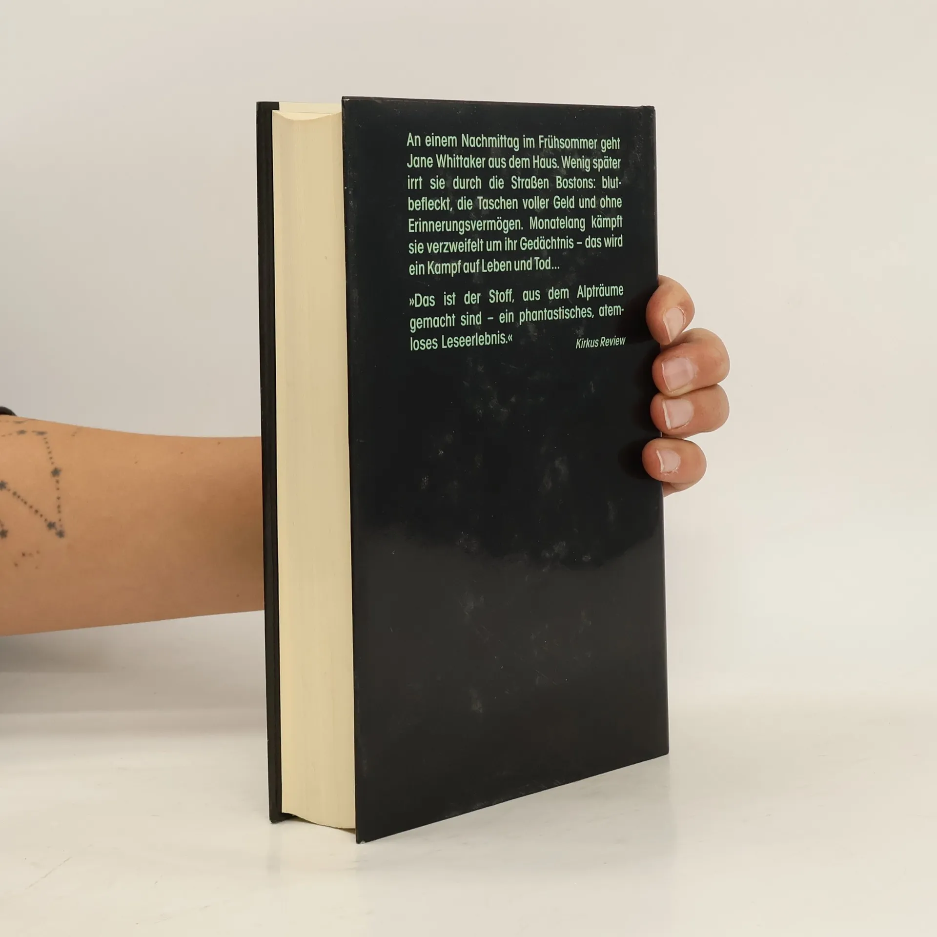 „An einem Nachmittag im Frühsommer ging Jane Whittaker zum Einkaufen und vergaß, wer sie war…“ So beginnt der Alptraum einer Frau, die sich plötzlich blutbefleckt, die Taschen voller Geld und ohne Erinnerungsvermögen auf den Straßen Bostons wiederfindet. Wer ist dieser Mann, den man ihr als ihren Ehemann vorstellt? Was sind das für Medikamente, die ihr angeblich helfen sollen? Und warum fühlt sie sich als Gefangene im eigenen Haus? Verzweifelt kämpft Jane von nun an um ihr Gedächtnis – es wird ein Kampf auf Leben und Tod …