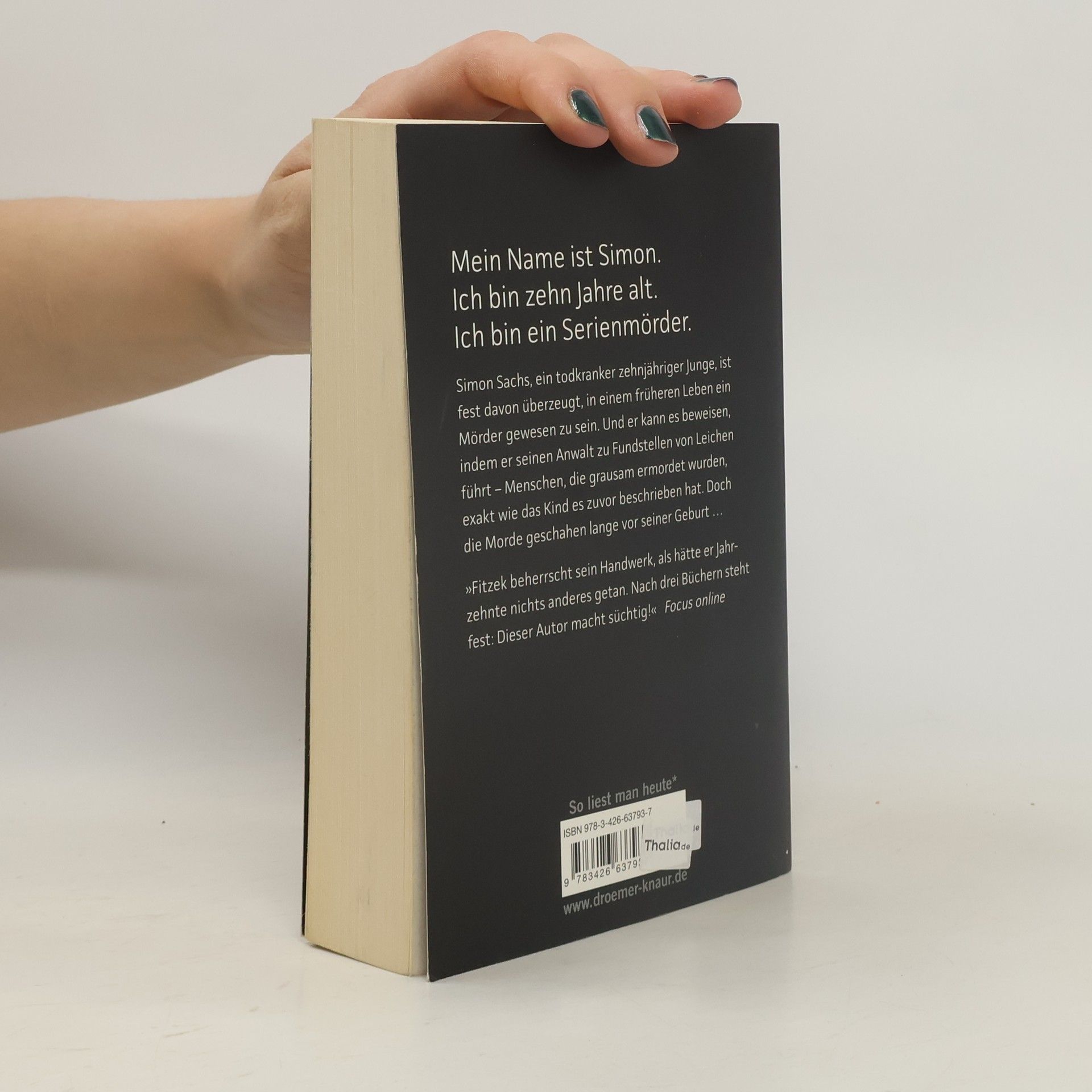 Robert Stern ahnt nicht, dass sein Treffen mit einem geheimnisvollen Mandanten auf einem abgelegenen Industriegelände ihn mit dem Tod konfrontieren wird. Der Mandant ist Simon, ein zerbrechlicher, todkranker zehnjähriger Junge, der überzeugt ist, in einem früheren Leben ein Mörder gewesen zu sein. Sterns Verwirrung verwandelt sich in Entsetzen, als er in einem von Simon beschriebenen Keller tatsächlich menschliche Überreste findet: ein Skelett mit einem gespaltenen Schädel. Dies ist nur der Anfang, denn Simon berichtet von weiteren, vor Jahren hingerichteten Opfern, und bald wird die Gegenwart ebenfalls mörderisch. Dieser Psychothriller ist hochspannend und unerwartet, mit Wendungen, die den Leser fesseln. Sebastian Fitzek gelingt es, mit ungewöhnlichen Figuren und einer packenden Handlung zu überzeugen. Sein Geschick, Spannung aufzubauen, sorgt dafür, dass dieser Roman den Schlaf raubt. Fitzek beherrscht sein Handwerk meisterhaft und hat sich als süchtig machender Autor etabliert.