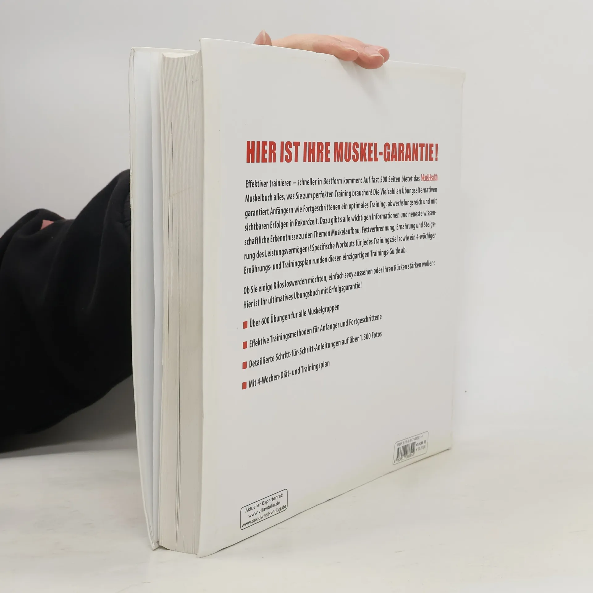 Hier ist Ihre Muskel-Garantie! Effektiver trainieren – schneller in Bestform kommen: Auf fast 500 Seiten bietet „Das Men’s Health Muskelbuch“ alles, was Sie zum perfekten Training brauchen! Mehr als 600 Übungen für alle Muskelgruppen, übersichtlich gegliedert werden auf rund 1200 Fotos anschaulich und nachvollziehbar dargestellt. Die Vielzahl an Übungsalternativen garantiert sowohl Anfängern wie Fortgeschrittenen ein optimales Training, abwechslungsreich und mit sichtbaren Erfolgen in Rekordzeit. Dazu gibt‘s alle wichtigen Informationen und neueste wissenschaftliche Erkenntnisse zu den Themen Muskelaufbau, Fettverbrennung, Ernährung und Steigerung des Leistungsvermögens! Spezifische Workouts für jedes Trainingsziel sowie ein 4-wöchiger Ernährungs-und-Trainingsplan runden diesen einzigartigen Trainings-Guide ab. Ob Sie einige Kilos loswerden möchten, einfach sexy aussehen oder Ihren Rücken stärken wollen: Hier ist Ihr ultimatives Übungsbuch mit Erfolgsgarantie! Ausstattung: durchgehend 4c