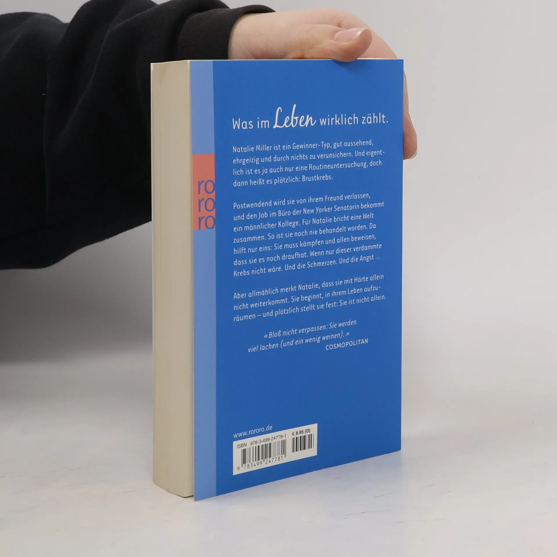Was im Leben wirklich zählt Natalie Miller ist ein Gewinner-Typ, gut aussehend, ehrgeizig und durch nichts zu verunsichern. Und eigentlich ist es ja auch nur eine Routineuntersuchung, doch dann heißt es plötzlich: Brustkrebs. Postwendend wird sie von ihrem Freund verlassen, und den Job im Büro der New Yorker Senatorin bekommt ein männlicher Kollege. Für Natalie bricht eine Welt zusammen. So ist sie noch nie behandelt worden. Da hilft nur eins: Sie muss kämpfen und allen beweisen, dass sie es noch draufhat. Wenn nur dieser verdammte Krebs nicht wäre. Und die Schmerzen. Und die Angst … Aber allmählich merkt Natalie, dass sie mit Härte allein nicht weiterkommt. Sie beginnt, in ihrem Leben aufzuräumen – und plötzlich stellt sie fest: Sie ist nicht allein. „Bloß nicht verpassen: Sie werden viel lachen (und ein wenig weinen).“ (Cosmopolitan)