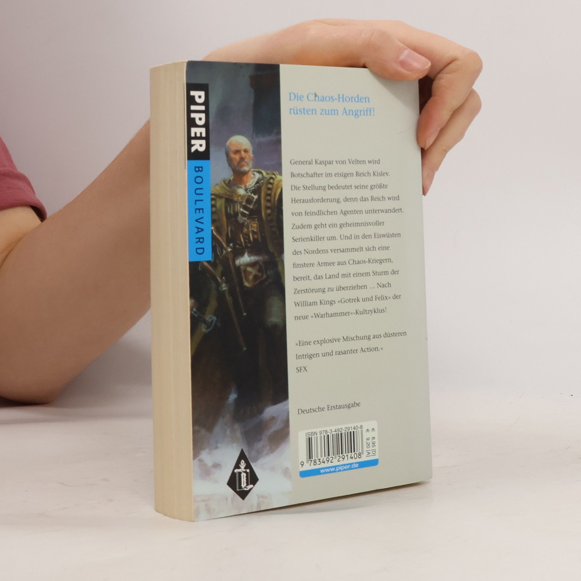 Der ehemalige General Kaspar von Velten tritt einen Posten als Botschafter im eisigen Reich Kislev an. Die Stellung bedeutet seine größte Herausforderung, denn das Reich wird von feindlichen Agenten und Schurken unterwandert. Zudem geht ein geheimnisvoller Serienkiller um. Und in den Eiswüsten des Nordens versammelt sich eine finstere Armee aus Chaos-Kriegern, bereit, das Land mit einem Sturm der Zerstörung zu überziehen … Nach William Kings 'Gotrek und Felix' der neue Kultzyklus aus der britischen 'Warhammer'-Fantasyschmiede! 'Eine explosive Mischung aus düsteren Intrigen und rasanter Action.' SFX