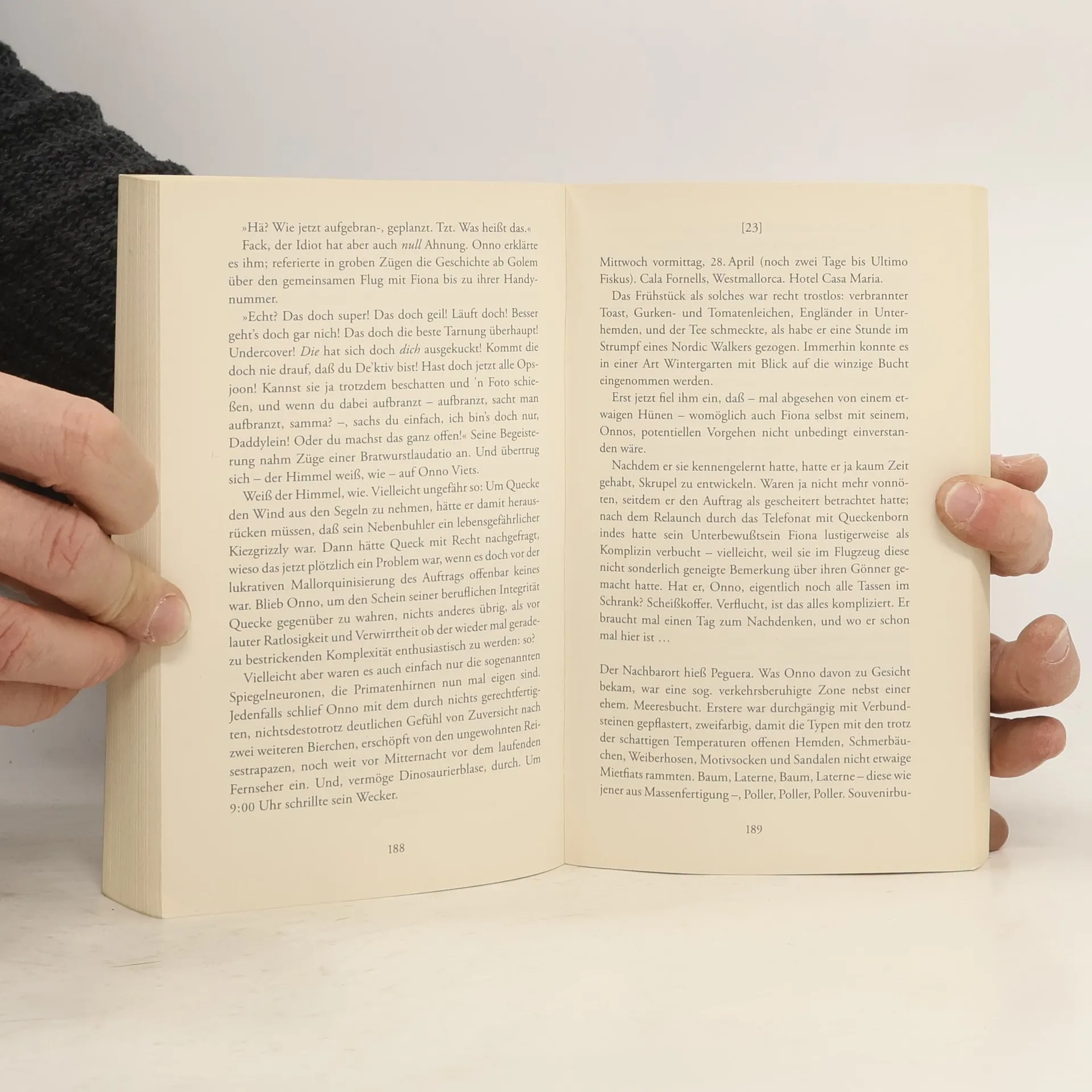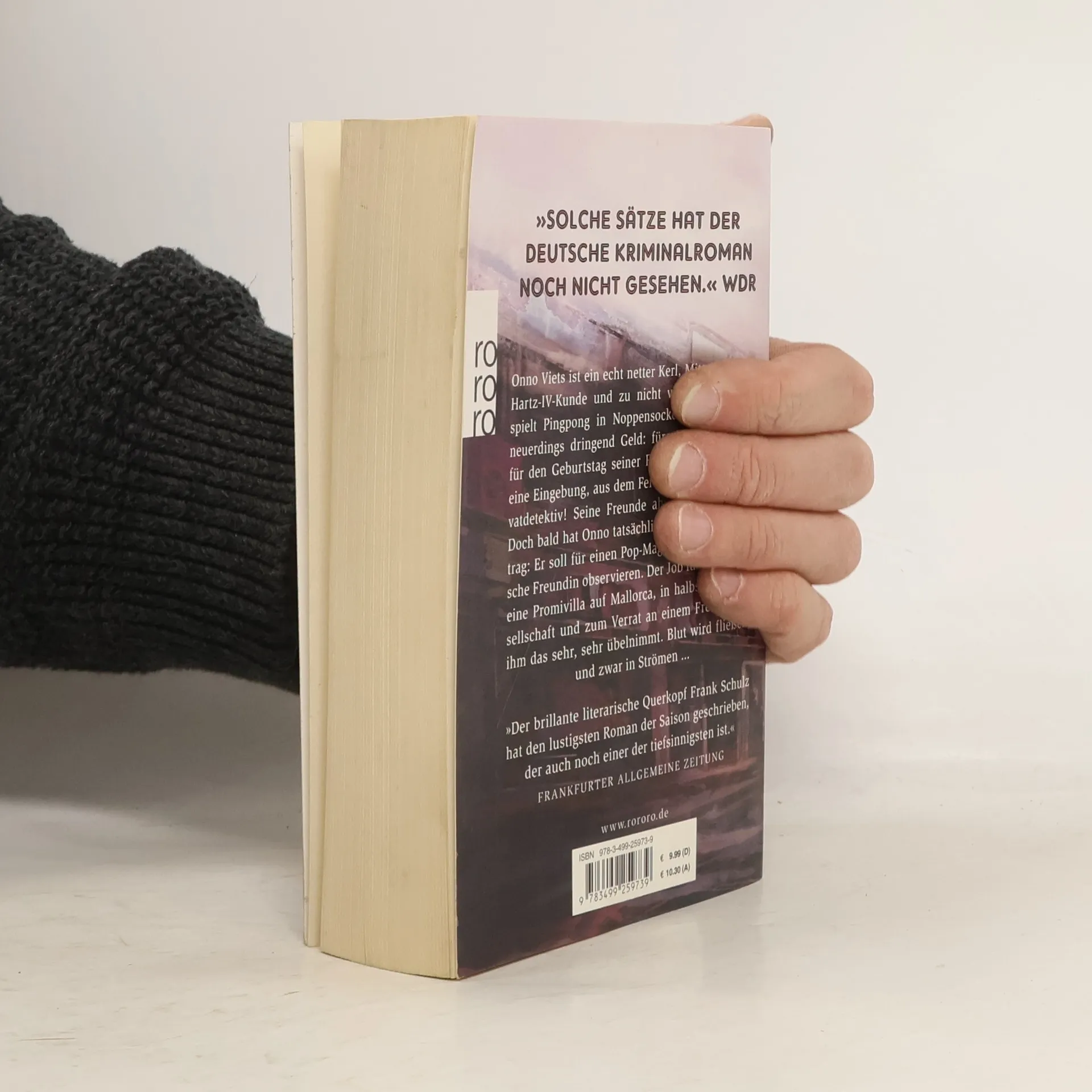 Onno Viets ist ein echt netter Kerl, Mitte fünfzig, Hartz-IV-Kunde und zu nicht vielem nutze. Er spielt Pingpong in Noppensocken und braucht neuerdings dringend Geld: fürs Finanzamt und für den Geburtstag seiner Frau Edda. Da hat er eine Eingebung, aus dem Fernsehen: Er wird Privatdetektiv! Seine Freunde ahnen Schlimmstes. Doch bald hat Onno tatsächlich einen ersten Auftrag: Er soll für einen Pop-Magnaten dessen hübsche Freundin observieren. Der Job führt Onno in eine Promivilla auf Mallorca, in halbseidene Gesellschaft und zum Verrat an einem Freund, der ihm das sehr, sehr übel nimmt. Blut wird fließen, und zwar in Strömen …