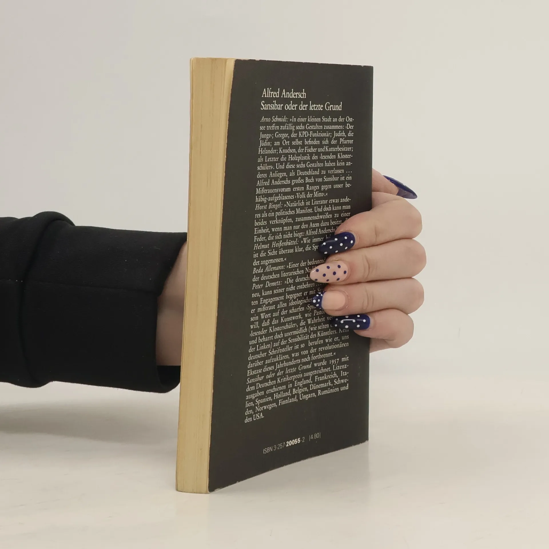 In einer kleinen Stadt an der Ostsee treffen zufällig sechs Gestalten zusammen: ›Der Junge‹; Gregor, der KPD-Funktionär; Judith, die Jüdin; am Ort selbst befinden sich der Pfarrer Helander; Knudsen, der Fischer und Kutterbesitzer; als letzter die Holzplastik des ›Lesenden Klosterschülers‹. Und diese sechs Gestalten haben kein anderes Anliegen, als Deutschland zu verlassen... Alfred Anderschs großes Buch von Sansibar ist ein Mißtrauensvotum ersten Ranges gegen unser behäbig aufgeblasenes ›Volk der Mitte‹.
