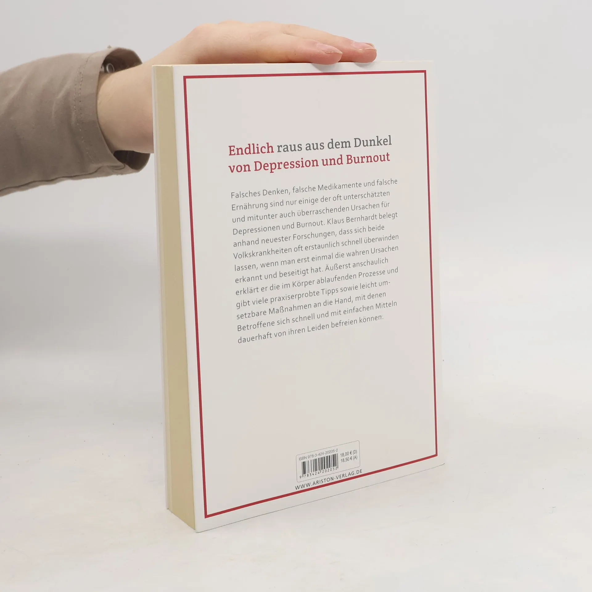 Endlich raus aus dem Dunkel der Depression Falsche Ernährung, falsche Medikamente, falsches Denken sind nur einige der oft überraschenden und unterschätzten Ursachen für die meisten Formen von Depressionen, Burnout und Angsterkrankungen. Klaus Bernhardt zeigt anhand neuester Forschungen, dass es sich bei diesen Krankheiten oft um psychische und körperliche Reaktionen auf Mangelerscheinungen und Stresssituationen handelt. Äußerst zugänglich erklärt er die im Körper ablaufenden Prozesse und gibt unzählige praxiserprobte Tipps sowie leicht umsetzbare Maßnahmen an die Hand, was Betroffene tun können, um sich mit einfachen Mitteln schnell und dauerhaft von ihren Leiden zu befreien.