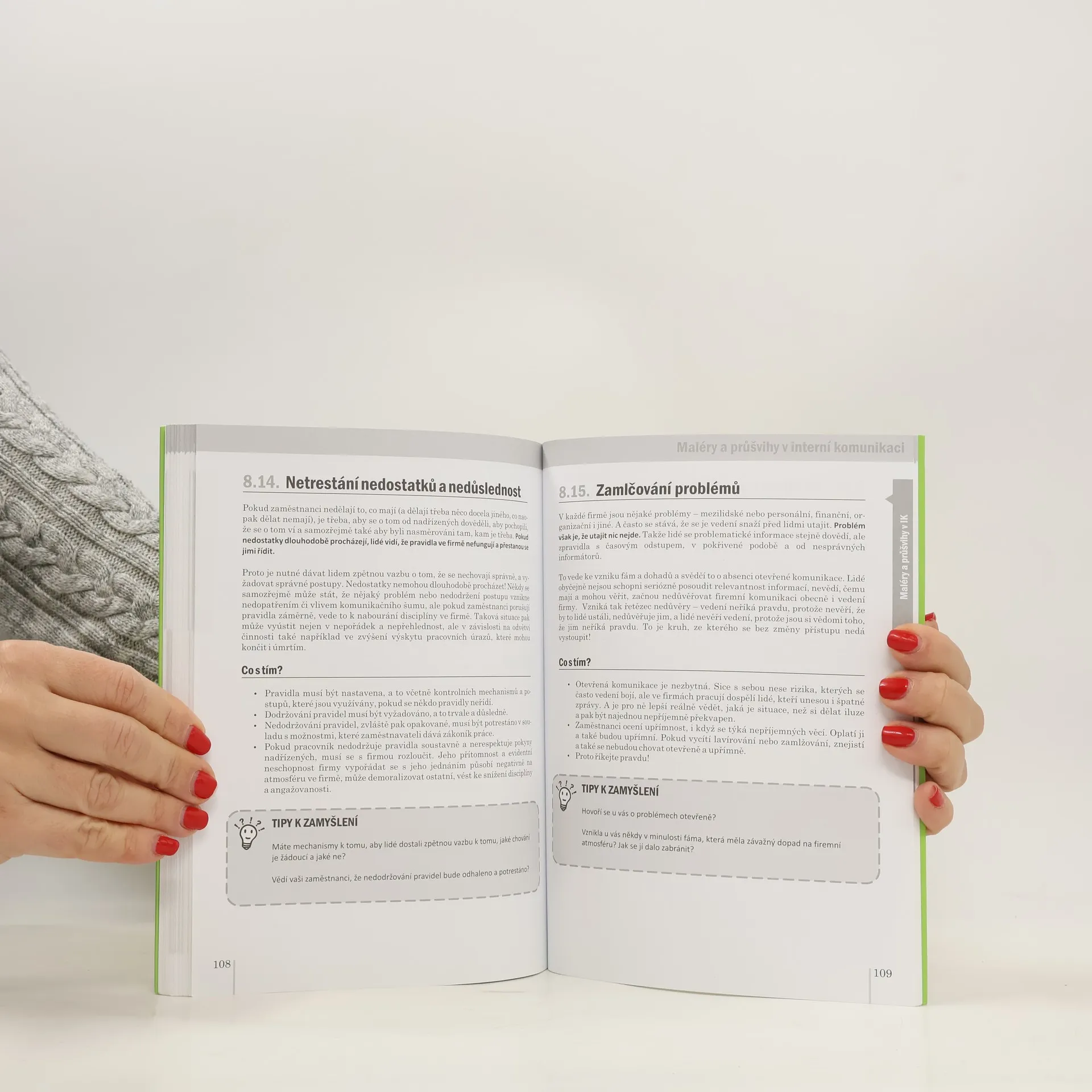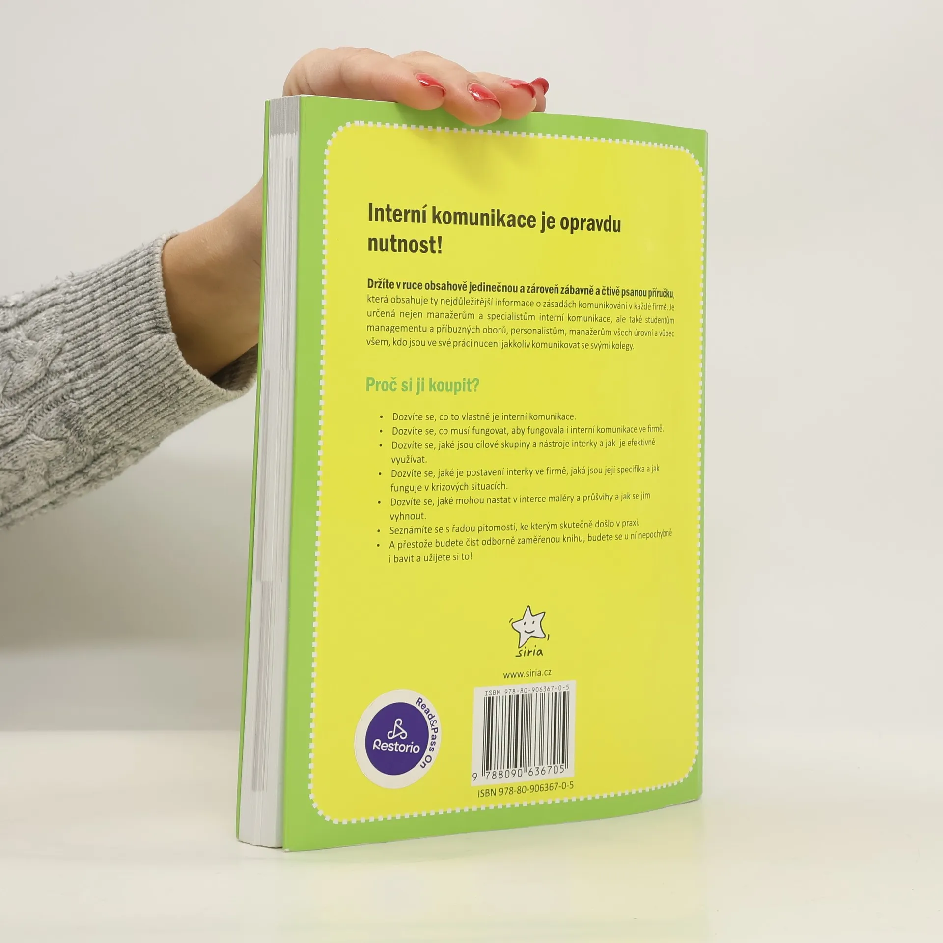 Kniha proto svižnou a čtivou formou shrnuje, co musí ve firmě fungovat, aby fungovala také interní komunikace, jaká je praxe ve firmě, jaké jsou cílové skupiny a komunikační kanály a jak je využívat. Přináší manažerům fígle, s jejichž pomocí mohou firemní komunikaci zlepšit, zabývá se i krizovou interní komunikací a rozebírá velké množství malérů a průšvihů, které mohou v interní komunikaci nastat. Čtenář se dozví, co v interní komunikaci nedělat a čemu se vyhnout, a za každou kapitolou najde tipy k zamyšlení, díky kterým si může uvědomit, co by se právě v jeho firmě dalo zlepšit. Kniha se bude hodit všem specialistům a manažerům interní komunikace, pracovníkům lidských zdrojů, manažerům a vůbec všem, kdo v rámci své práce musí organizovaně komunikovat s kolegy. Ocení ji také studenti managementu, marketingu, personalistiky a sociálních věd.