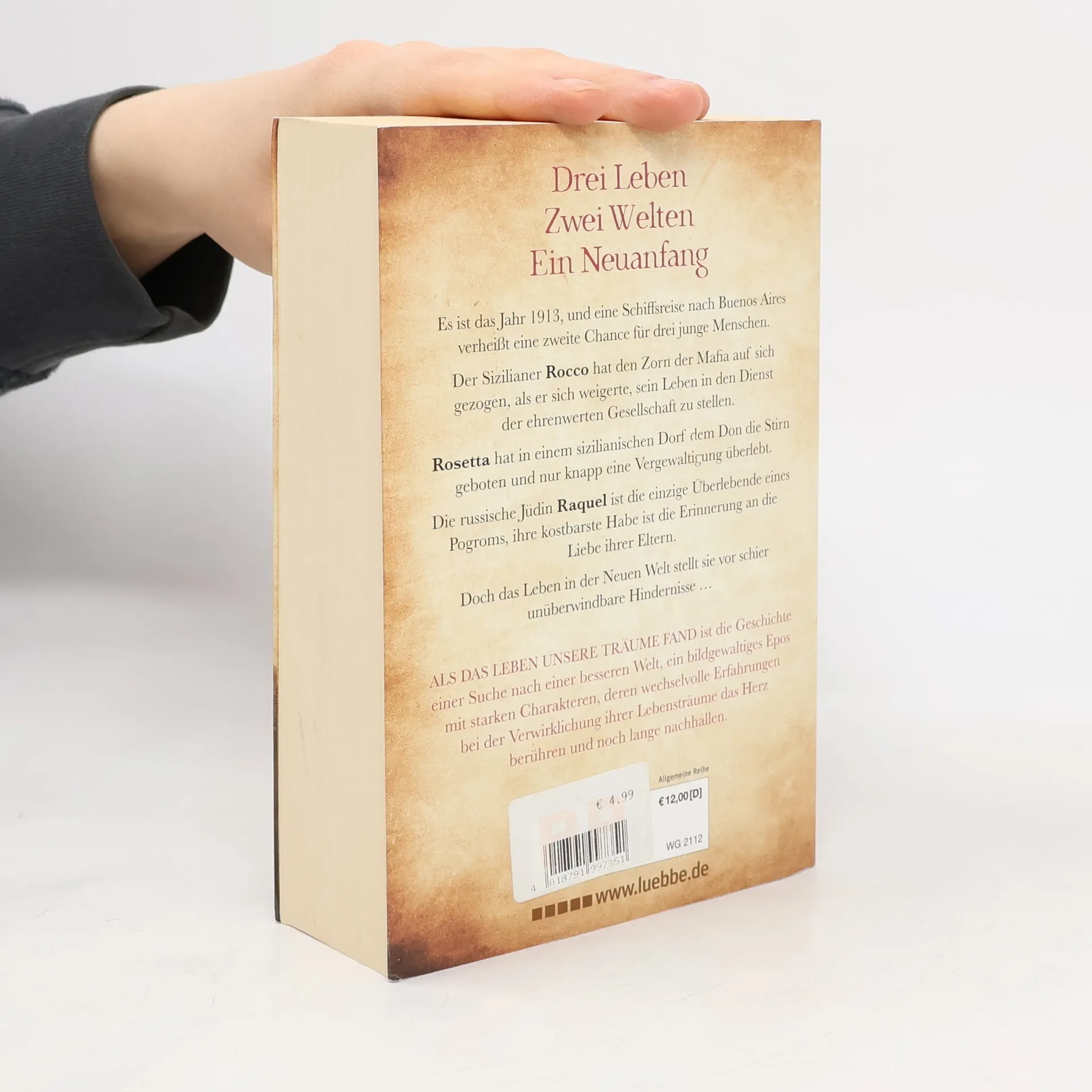 Es ist das Jahr 1913, und eine Schiffsreise nach Buenos Aires verheißt eine zweite Chance für drei junge Menschen. Der Sizilianer Rocco hat den Zorn der Mafia auf sich gezogen, als er sich weigerte, sein Leben in den Dienst der ehrenwerten Gesellschaft zu stellen. Rosetta hat in einem sizilianischen Dorf dem Don die Stirn geboten und nur knapp eine Vergewaltigung überlebt. Die russische Jüdin Raquel ist die einzige Überlebende eines Pogroms, ihre kostbarste Habe ist die Erinnerung an die Liebe ihrer Eltern. Doch das Leben in der Neuen Welt stellt sie vor schier unüberwindbare Hindernisse ...