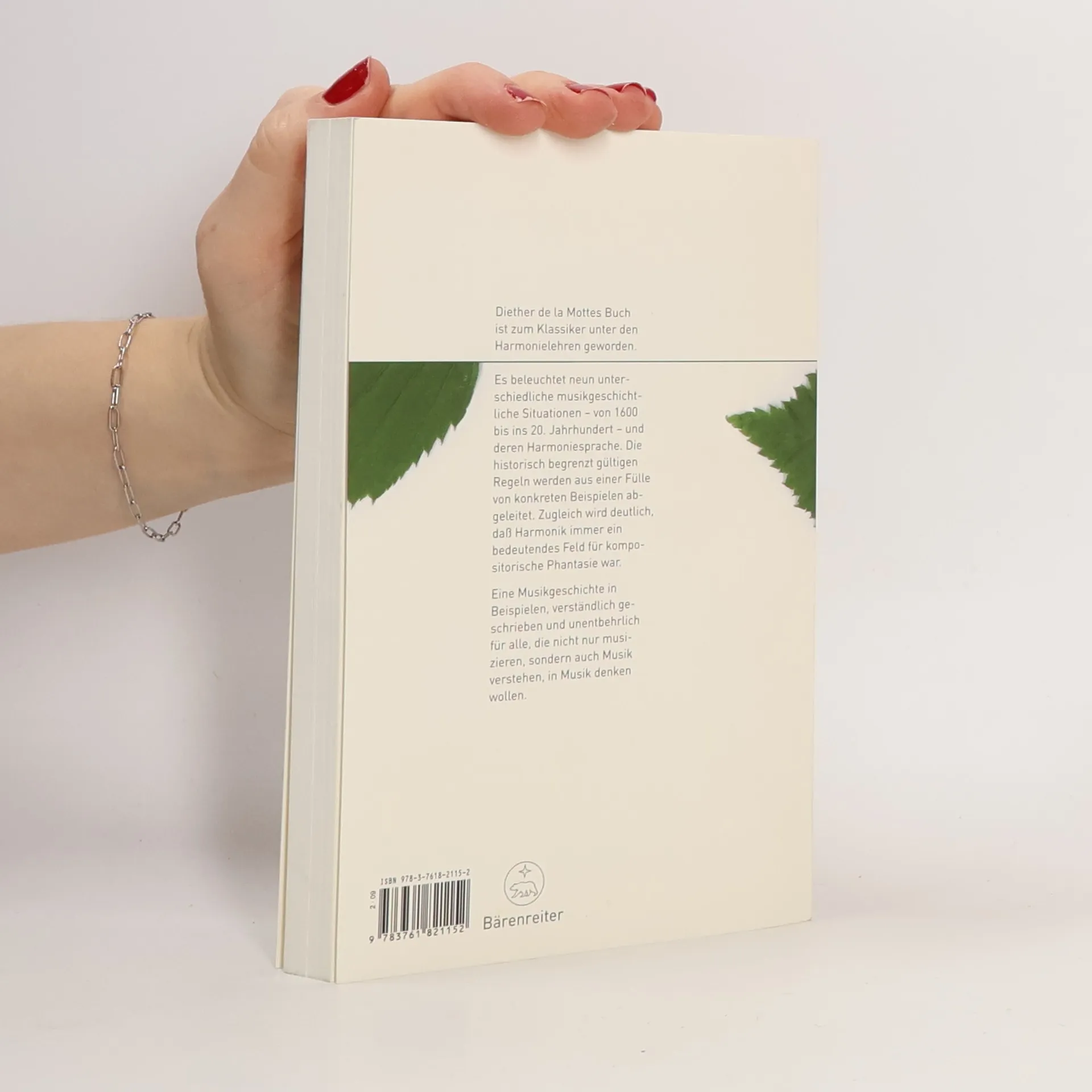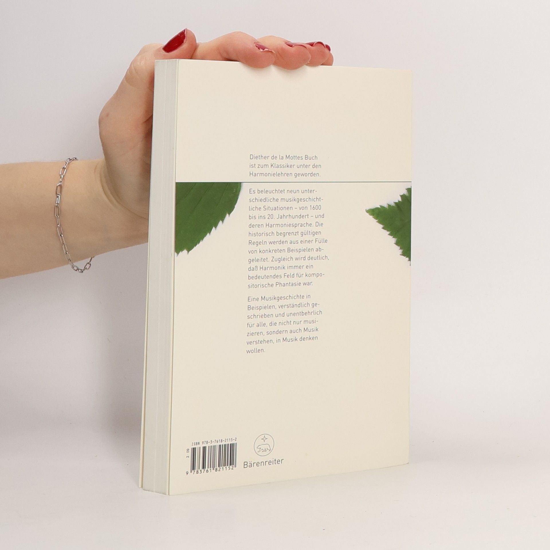 Diether de la Mottes Buch ist zum Klassiker unter den Harmonielehren geworden. Es beleuchtet neun unterschiedliche musikgeschichtliche Situationen – von 1600 bis ins 20. Jahrhundert – und deren Harmoniesprache. Die historisch begrenzt gültigen Regeln werden aus einer Fülle von konkreten Beispielen abgeleitet. Zugleich wird deutlich, dass Harmonik immer ein bedeutendes Feld für kompositorische Phantasie war. Eine Musikgeschichte in Beispielen, verständlich geschrieben und unentbehrlich für alle, die nicht nur musizieren, sondern auch Musik verstehen, in Musik denken wollen. Der Autor: Diether de la Motte, 1928 in Bonn geboren, studierte in Detmold Komposition, Klavier und Dirigieren, war Dozent und Musikkritiker in Düsseldorf, Verlagslektor in Mainz, wurde 1964 Professor an der Hamburger Musikhochschule, 1982 in Hannover und von 1988 bis 1998 in Wien.