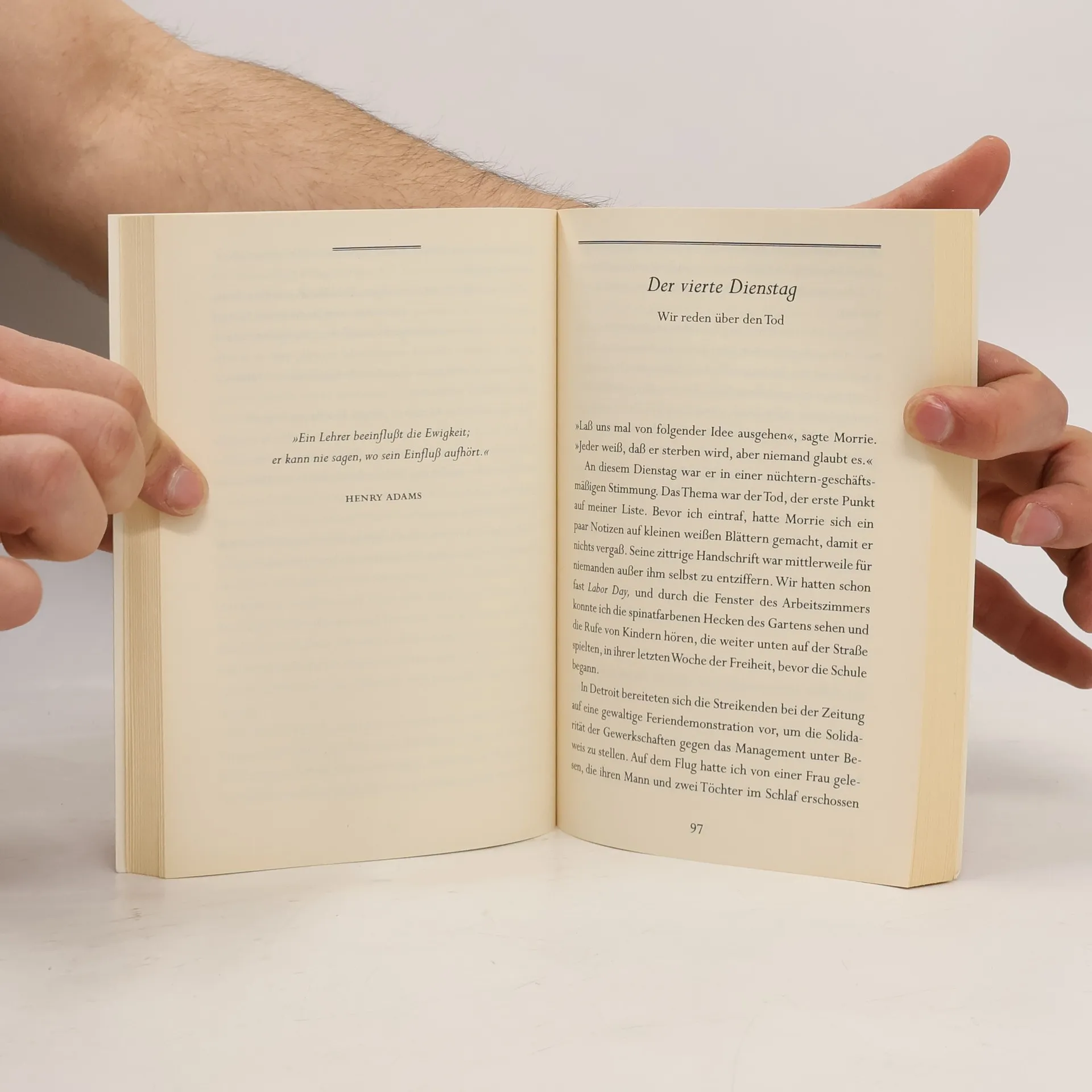 »Wenn du lernst, wie man stirbt, dann lernst du, wie man lebt.« Als er erfährt, dass sein ehemaliger Professor Morrie Schwartz schwer erkrankt ist und bald sterben wird, beginnt der Journalist Mitch Albom seinen Lehrer jede Woche zu besuchen. Und er, der meinte, dem Sterbenden Kraft und Trost spenden zu müssen, lernt stattdessen dienstags bei Morrie das Leben neu zu betrachten und zu verstehen.