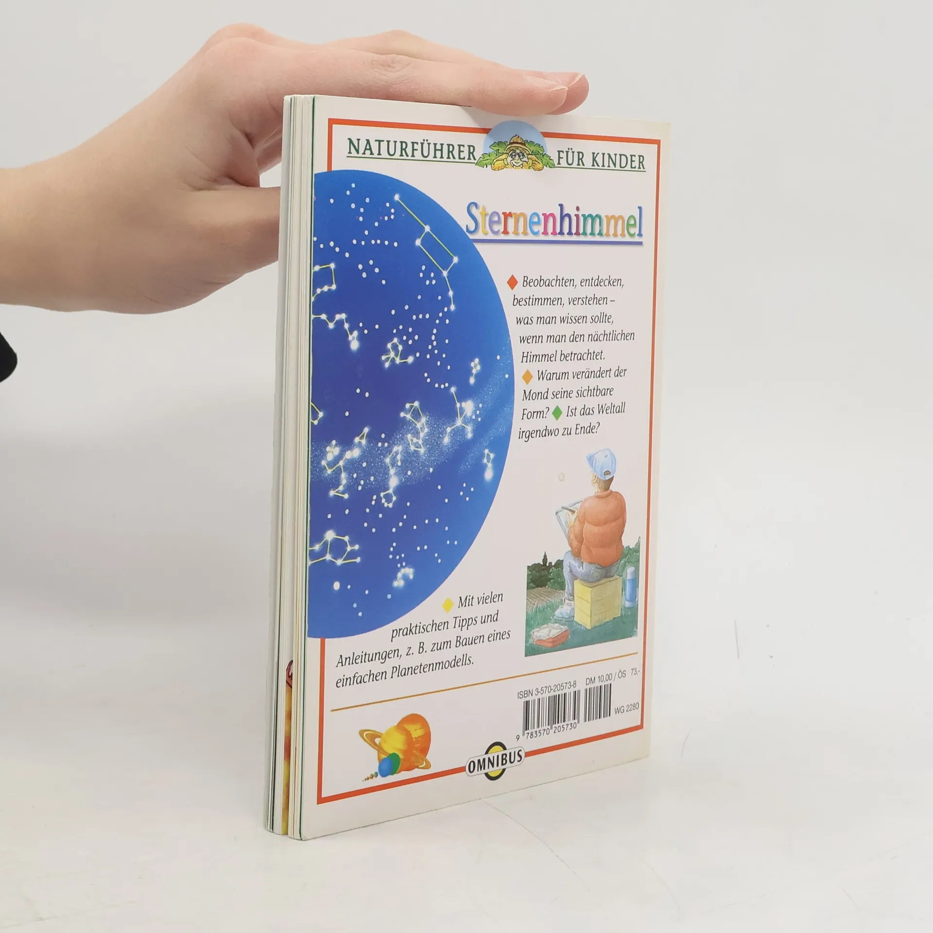Was ist ein Stern? Warum sieht der Mond immer anders aus? Ist das Weltall irgendwo zu Ende? Solche und noch viele andere Fragen zu den Themen Sternenhimmel, Sonnensystem und Weltall werden in diesem Buch beantwortet. Es zeigt z. B., wie man die Sternbilder erkennt, beschreibt die unterschiedlichen Planeten und erklärt, wie eine Sternschnuppe entsteht. Dazu gibt es zahlreiche praktische Tipps zum Himmelsbeobachtung, z. B., wie man seine Augen schützt, wenn man die Sonne betrachten will, und Bastelanleitungen, z. B. zum Bau eines Planetenmodells.