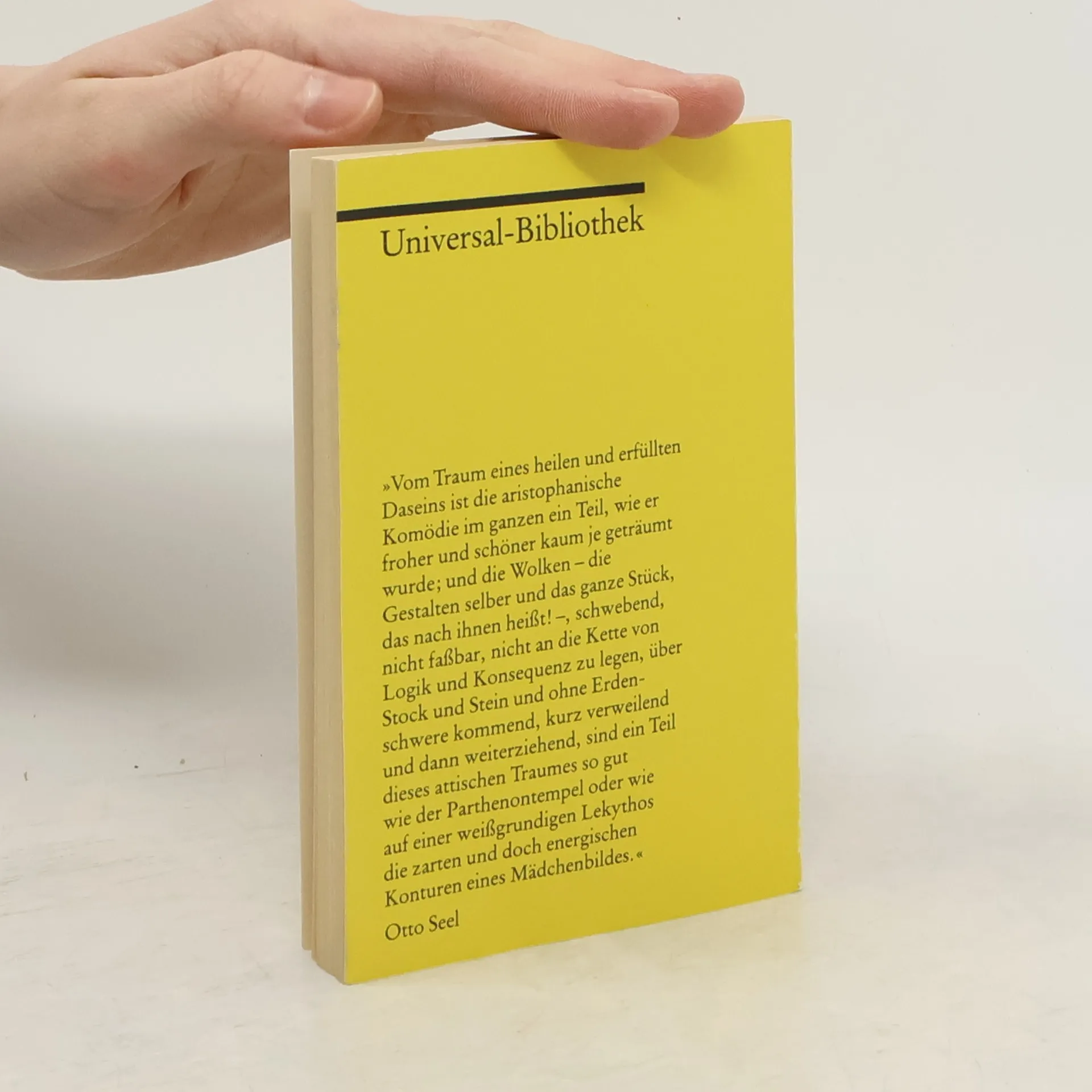 »Vom Traum eines heilen und erfüllten Daseins ist die aristophanische Komödie im ganzen ein Teil, wie er froher und schöner kaum je geträumt wurde; und die Wolken - die Gestalten selber und das ganze Stück, das nach ihnen heißt! -, schwebend, nicht faßbar, nicht an die Kette von Logik und Konsequenz zu legen, über Stock und Stein und ohne Erdenschwere kommend, kurz verweilend und dann weiterziehend, sind ein Teil dieses attischen Traumes so gut wie der Parthenontempel oder wie auf einer weißgrundigen Lekythos die zarten und doch energischen Konturen eines Mädchenbildes.« Otto Seel