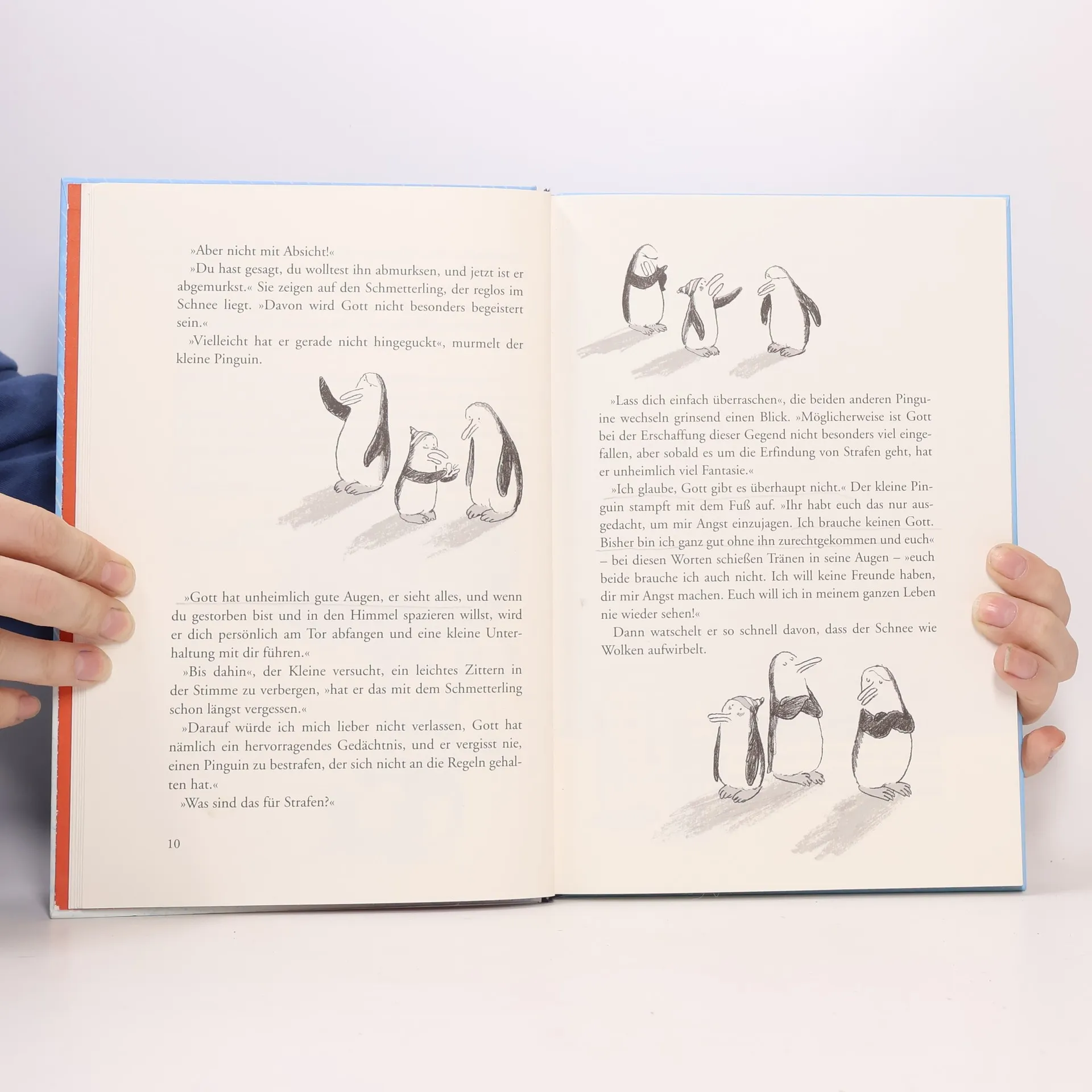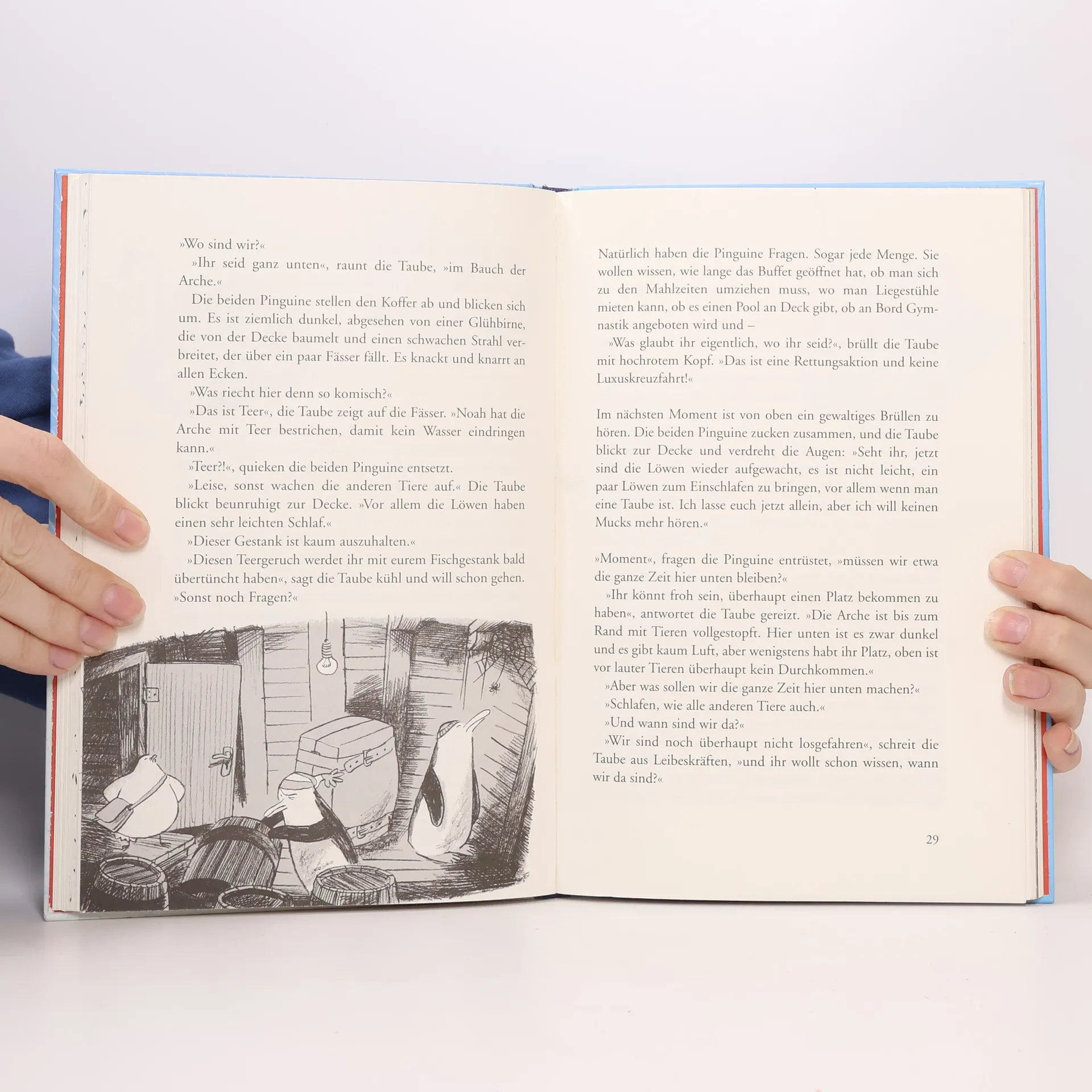 Pinguine streiten gerne. Auch über die Frage nach Gott. Sieht Gott alles? Gibt er Regeln vor? Oder gibt es ihn vielleicht doch gar nicht? Noch während die drei Pinguine sich darüber streiten, beginnt es zu regnen: die Sintflut. Zwei Tickets für die Arche Noah sind noch zu kriegen. Aber was ist mit dem dritten Pinguin? Kurz entschlossen schmuggeln die zwei Pinguine den dritten auf die Arche. Eine turbulente Reise nimmt ihren Lauf. Auf wunderbar komische und gleichzeitig gehaltvolle Weise stellt das Buch viele wichtige Fragen nach Gott und nach dem Leben, ohne dabei auch nur eine einzige Antwort vorschnell vorzugeben. Passt Gott in den Koffer? Das vielfach ausgezeichnete Kindertheaterstück jetzt als Erzählung!