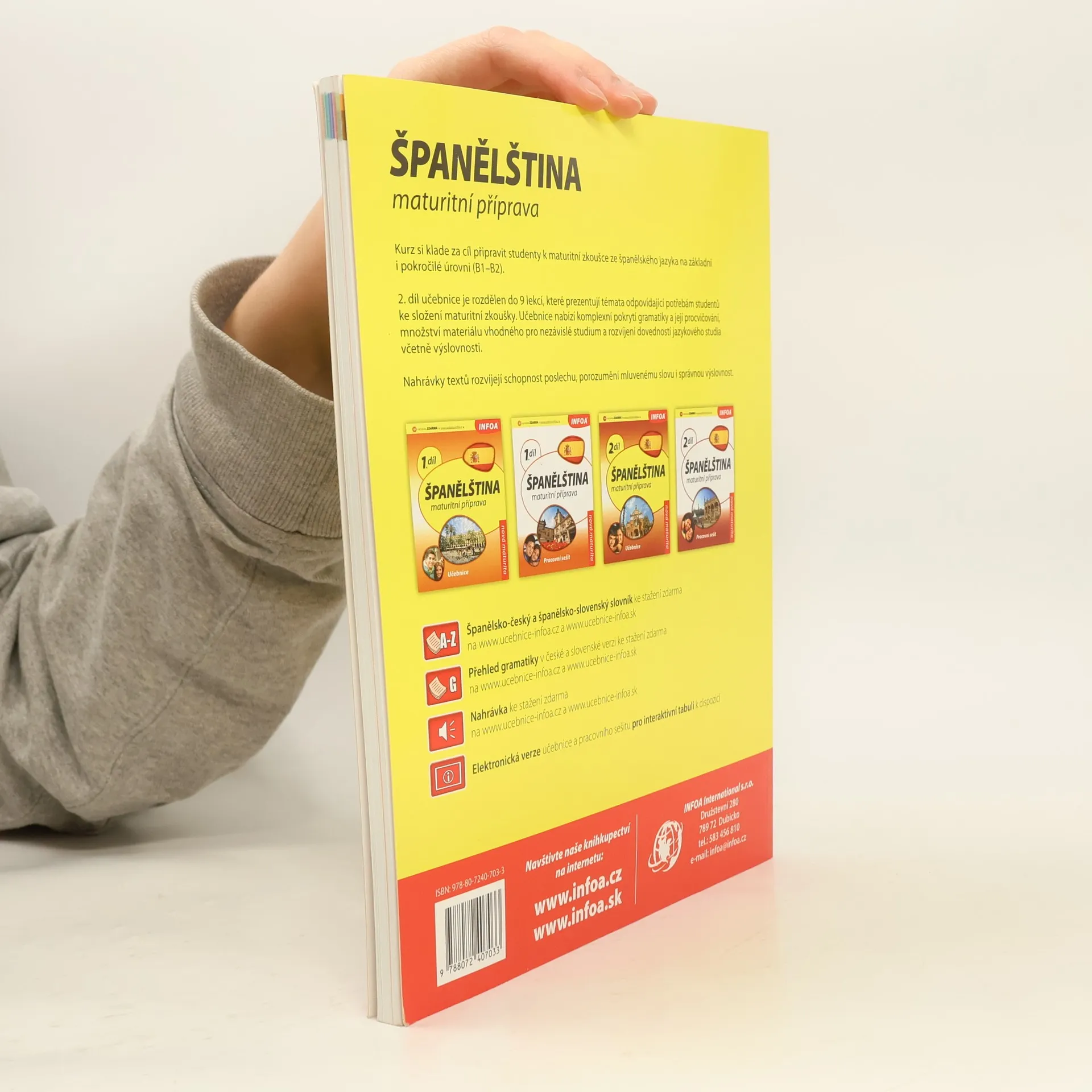 Kurz si klade za cíl připravit studenty k maturitní zkoušce ze španělského jazyka na základní i pokročilé úrovni (B1–B2). 2. díl učebnice je rozdělen do 9 lekcí, které prezentují témata odpovídající potřebám studentů ke složení maturitní zkoušky. Učebnice nabízí komplexní pokrytí gramatiky a její procvičování, množství materiálu vhodného pro nezávislé studium a rozvíjení dovedností jazykového studia včetně výslovnosti. Nahrávky textů rozvíjejí schopnost poslechu, porozumění mluvenému slovu i správnou výslovnost.