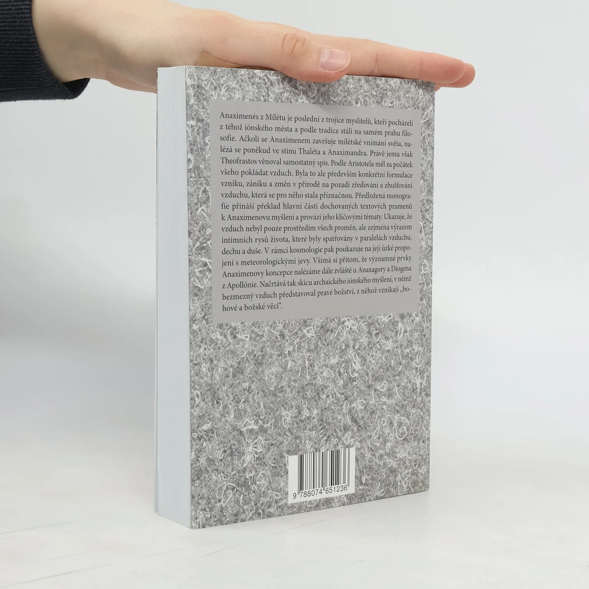 Anaximenés z Mílétu je poslední z trojice myslitelů, kteří pocházeli z téhož iónského města a podle tradice stáli na samém prahu filosofie. Ačkoli se Anaximenem završuje mílétské vnímání světa, nalézá se poněkud ve stínu Thaléta a Anaximandra. Právě jemu však Theofrastos věnoval samostatný spis. Podle Aristotela měl za počátek všeho pokládat vzduch. Byla to ale především konkrétní formulace vzniku, zániku a změn v přírodě na pozadí zřeďování a zhušťování vzduchu, která se pro něho stala příznačnou. Předložená monografie přináší překlad hlavní části dochovaných textových pramenů k Anaximenovu myšlení a provází jeho klíčovými tématy. Ukazuje, že vzduch nebyl pouze prostředím všech proměn, ale zejména výrazem intimních rysů života, které byly spatřovány v paralelách vzduchu, dechu a duše. V rámci kosmologie pak poukazuje na její úzké propojení s meteorologickými jevy. Všímá si přitom, že významné prvky Anaximenovy koncepce nalézáme dále zvláště u Anaxagory a Diogena z Apollónie. Načrtává tak skicu archaického iónského myšlení, v němž bezmezný vzduch představoval pravé božství, z něhož vznikají „bohové a božské věci“.