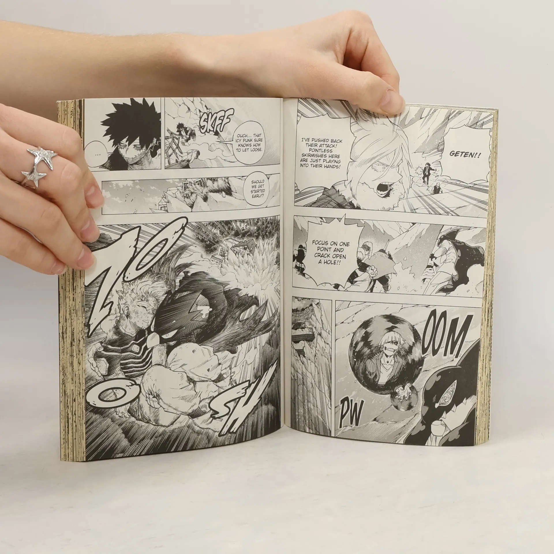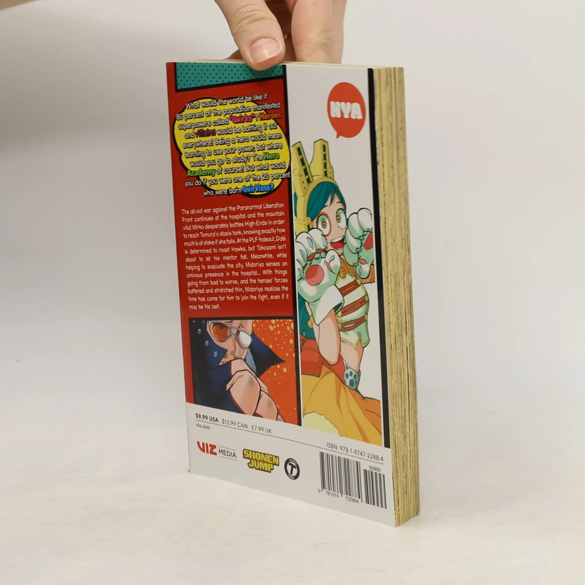 Midoriya inherits the superpower of the world’s greatest hero, but greatness won’t come easy. What would the world be like if 80 percent of the population manifested superpowers called “Quirks”? Heroes and villains would be battling it out everywhere! Being a hero would mean learning to use your power, but where would you go to study? The Hero Academy of course! But what would you do if you were one of the 20 percent who were born Quirkless? The all-out war against the Paranormal Liberation Front continues at the hospital and the mountain villa! Mirko desperately battles High-Ends in order to reach Tomura’s stasis tank, knowing exactly how much is at stake if she fails. At the PLF hideout, Dabi is determined to roast Hawks, but Tokoyami isn’t about to let his mentor fall. Meanwhile, while helping to evacuate the city, Midoriya senses an ominous presence that’s awoken in the hospital…