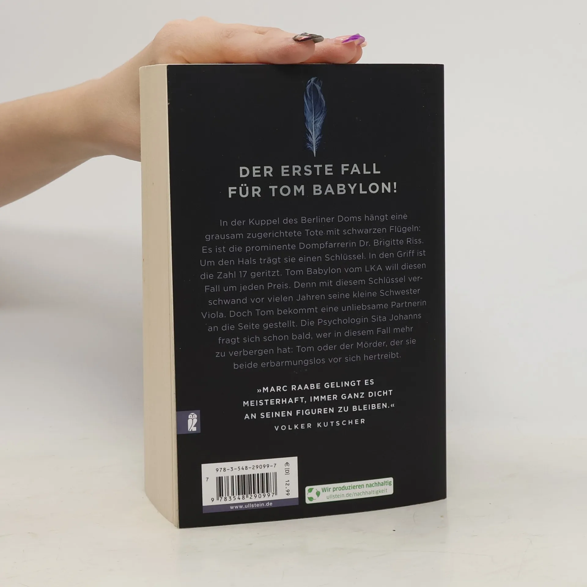 Volker Kutscher: „Marc Raabe gelingt es meisterhaft, immer ganz dicht an seinen Figuren zu bleiben.“ In der Kuppel des Berliner Doms hängt eine grausam zugerichtete Tote mit schwarzen Flügeln: Es ist die prominente Dompfarrerin Dr. Brigitte Riss. Um den Hals trägt sie einen Schlüssel. In den Griff ist die Zahl 17 geritzt. Tom Babylon vom LKA will diesen Fall um jeden Preis. Denn mit diesem Schlüssel verschwand vor vielen Jahren seine kleine Schwester Viola. Doch Tom bekommt eine unliebsame Partnerin an die Seite gestellt. Die Psychologin Sita Johanns fragt sich schon bald, wer in diesem Fall mehr zu verbergen hat: Tom oder der Mörder, der sie beide erbarmungslos vor sich hertreibt. Der erste Fall für Tom Babylon! „Süchtig machendes Kopfkino.“ Kölner Stadt Anzeiger über Heimweh