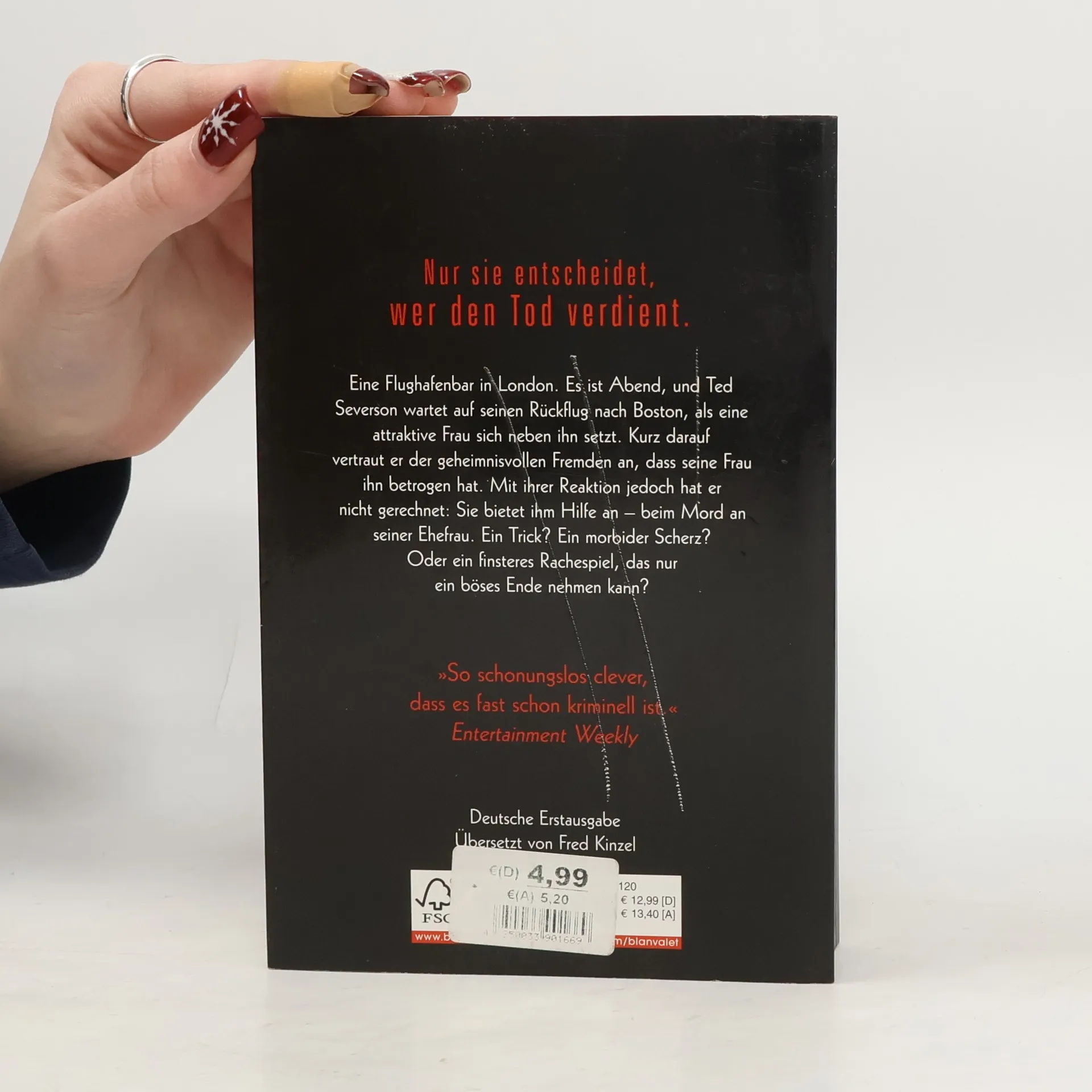 Nur sie entscheidet, wer den Tod verdient Eine Flughafenbar in London. Es ist Abend, und Ted Severson wartet auf seinen Rückflug nach Boston, als eine attraktive Frau sich neben ihn setzt. Kurz darauf vertraut er der geheimnisvollen Fremden an, dass seine Frau ihn betrogen hat. Mit ihrer Reaktion jedoch hat er nicht gerechnet: Sie bietet ihm Hilfe an – beim Mord an seiner Ehefrau. Ein Trick? Ein morbider Scherz? Oder ein finsteres Rachespiel, das nur ein böses Ende nehmen kann?